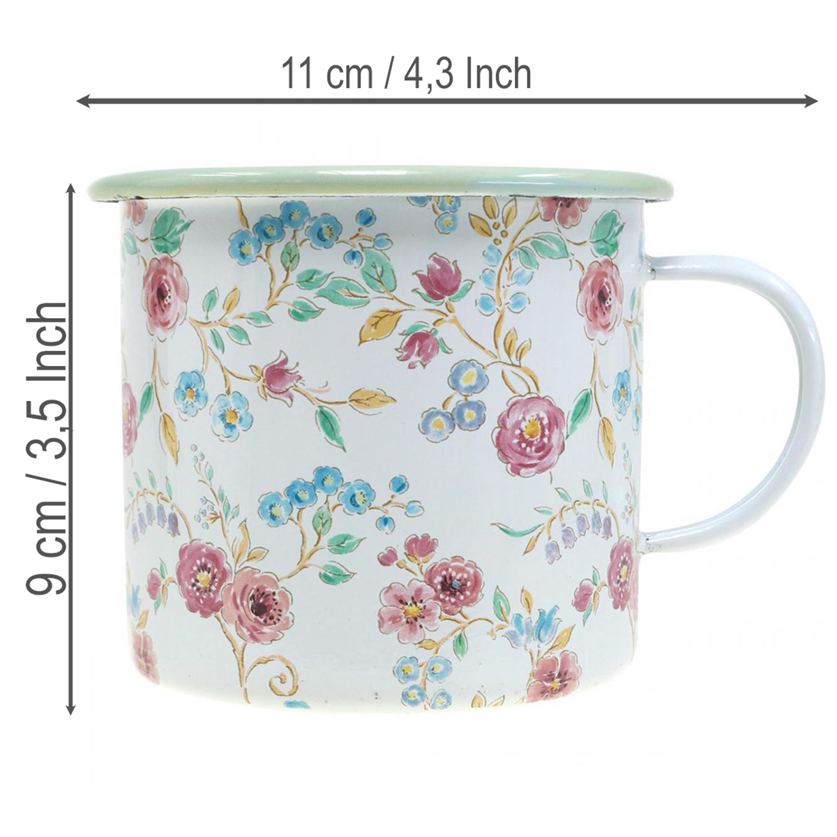 Donica z różami w jasnych pastelowych kolorach na białym tle oferuje emaliowaną dekorację nostalgicznie przywołującą lato. Dekoracyjny kubek z uchem ma pastelowe brzegi w kolorze jasnozielonym i jest nadrukowany dookoła z bogato zdobionym motywem kwiatowym. Kubeczek do sadzenia może być wypełniony cienką warstwą żwiru lub piasku jako drenaż i ziemia lub suchą lub mokrą pianką florystyczną.