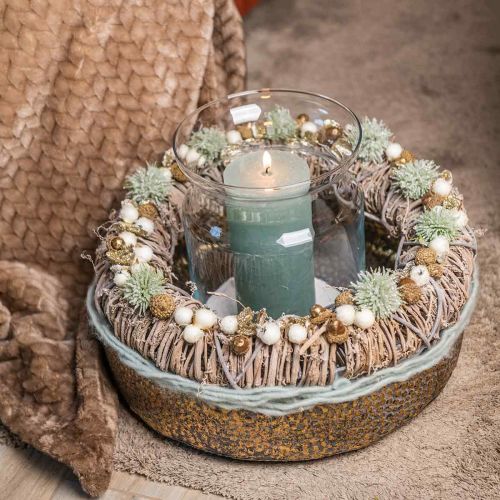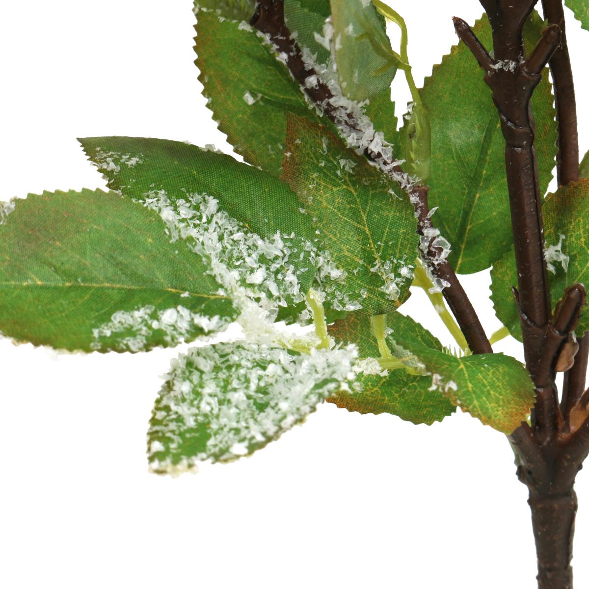 Długa rączka gałązki ozdobnej posiada metalowy rdzeń, dzięki czemu dekorację gałązki można elastycznie wkomponować w dowolną dekorację z kwiatów sztucznych. Ozdobna gałązka kilkakrotnie dzieli się u góry i pokryta jest licznymi białymi jagodami ze sztucznym śniegiem i zielonymi liśćmi.
