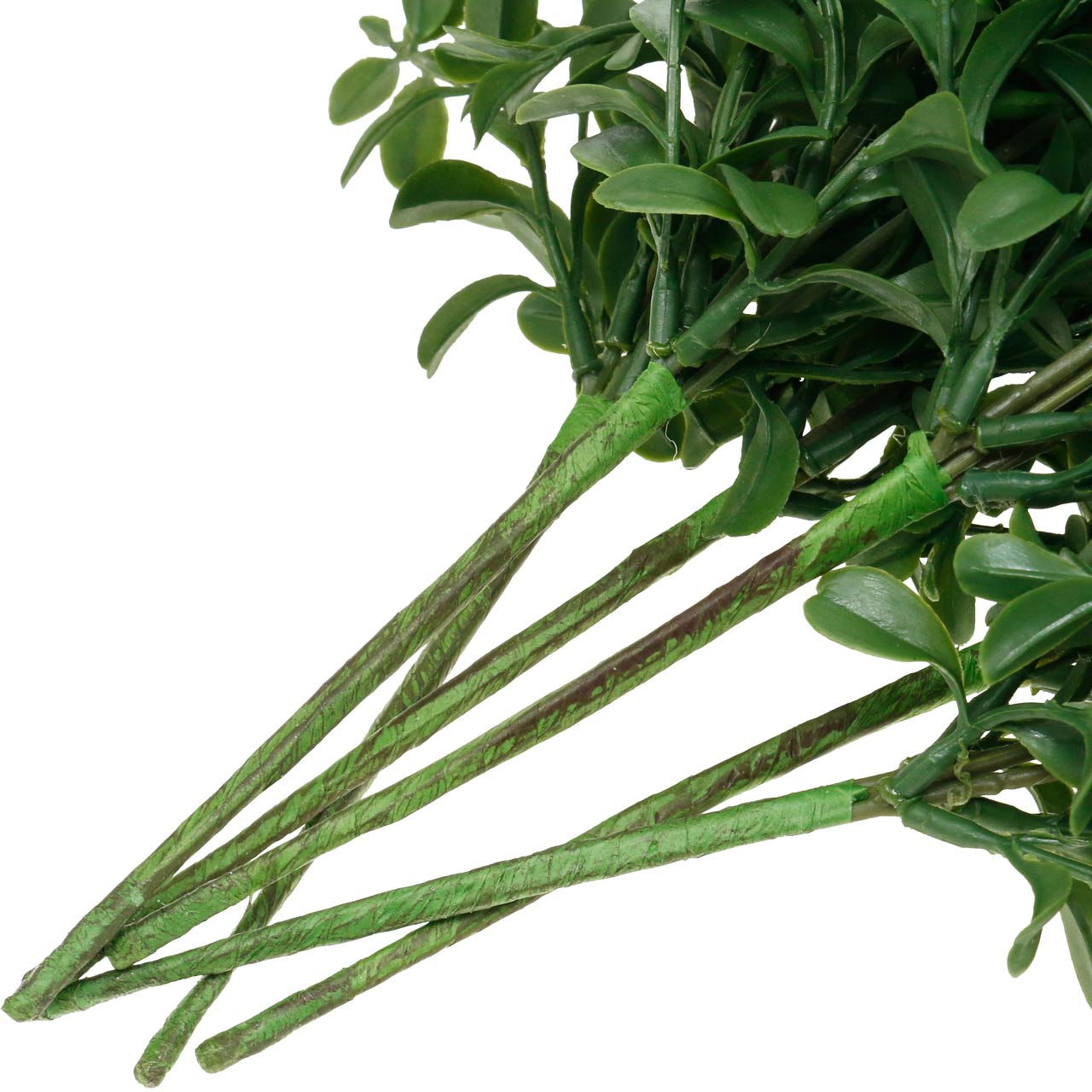Dostajesz sześć zielonych gałązek bukszpanu wykonanych z wysokiej jakości tworzywa sztucznego, każda z trzema pasmami zielonego papieru połączonymi w kilof. Dekoracja roślinna osiąga wysokość całkowitą ok. 32 cm.