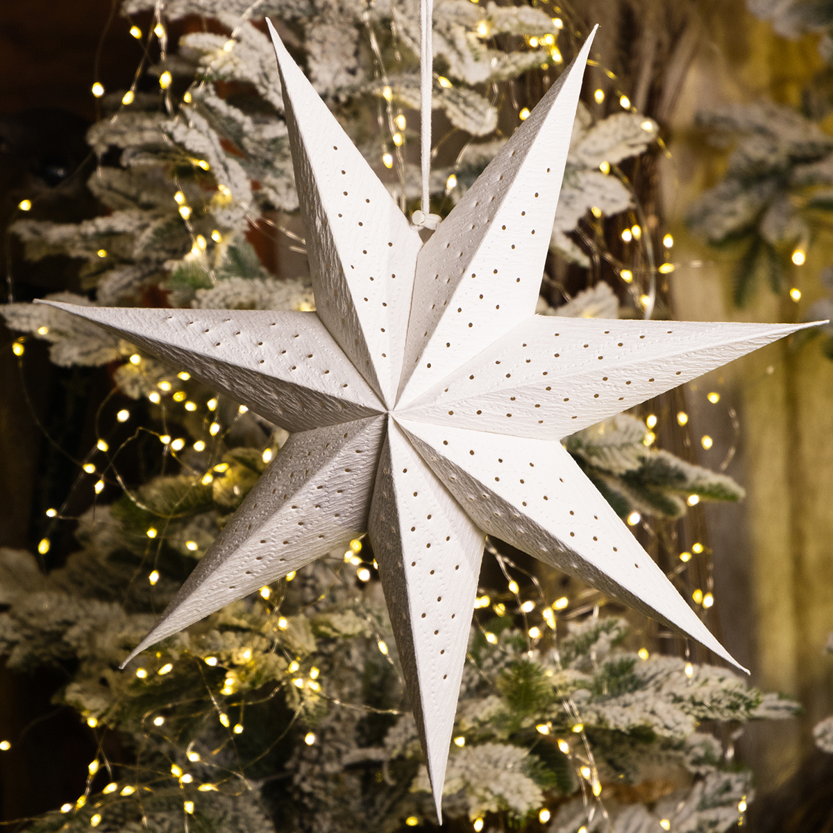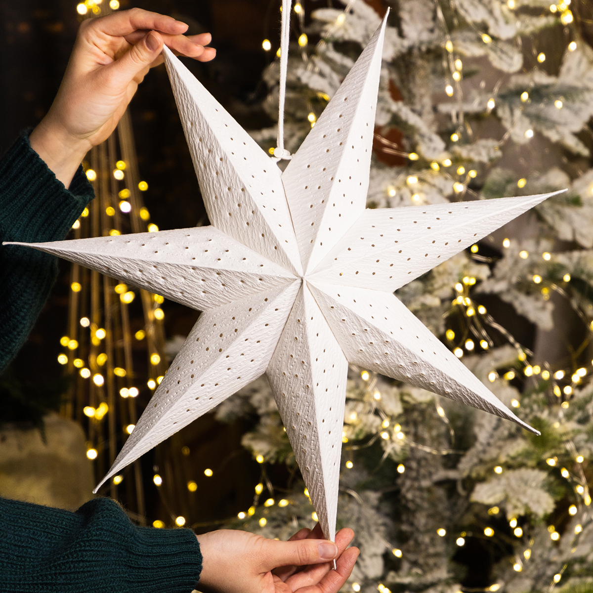 Te papierowe gwiazdki zachwycają nie tylko atrakcyjnym wzornictwem, ale także przemyślanymi detalami. Wykonane z wytrzymałego papieru, są wystarczająco trwałe, aby zdobić świąteczne dekoracje przez lata. Mając 45 cm, prezentują się olśniewająco w oknie, ale mogą również służyć jako eleganckie oświetlenie nad stołem w jadalni lub jako oryginalna ozdoba choinkowa. Miłośnicy prostszego, bardziej naturalnego wyglądu pokochają białe gwiazdki. Pięknie komponują się z gałązkami jodły, ośnieżonymi sztucznymi roślinami, subtelnymi bombkami choinkowymi i innymi papierowymi dekoracjami.
