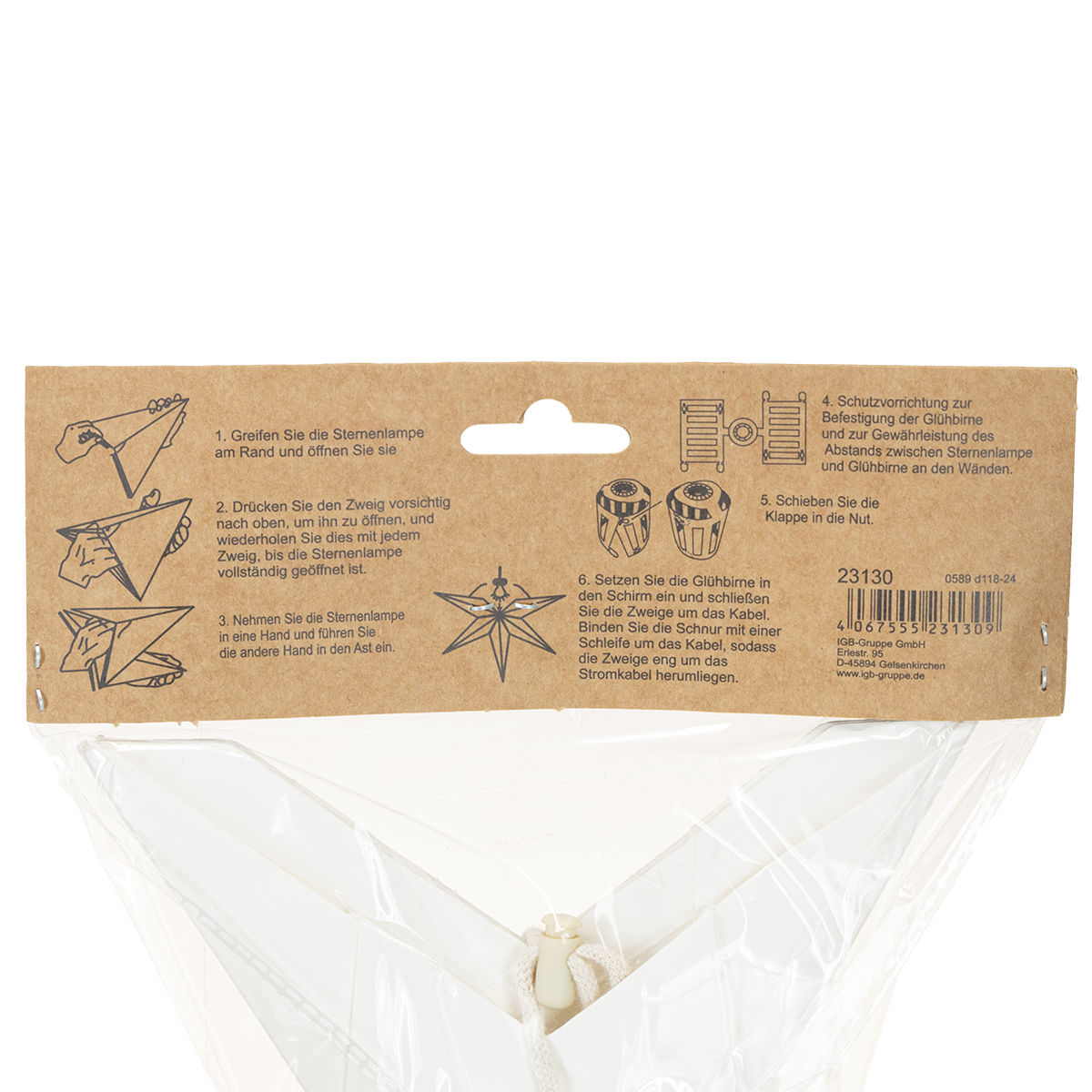 Wykonane z wytrzymałego, trwałego papieru, te dekoracyjne gwiazdki emanują naturalnością i minimalizmem. Pasujący bawełniany sznurek ze zintegrowanym ogranicznikiem jest zarówno praktyczny, jak i atrakcyjny wizualnie. Ten starannie zaprojektowany system zawieszania ułatwia ustawienie gwiazdek i gwarantuje idealne wyrównanie.