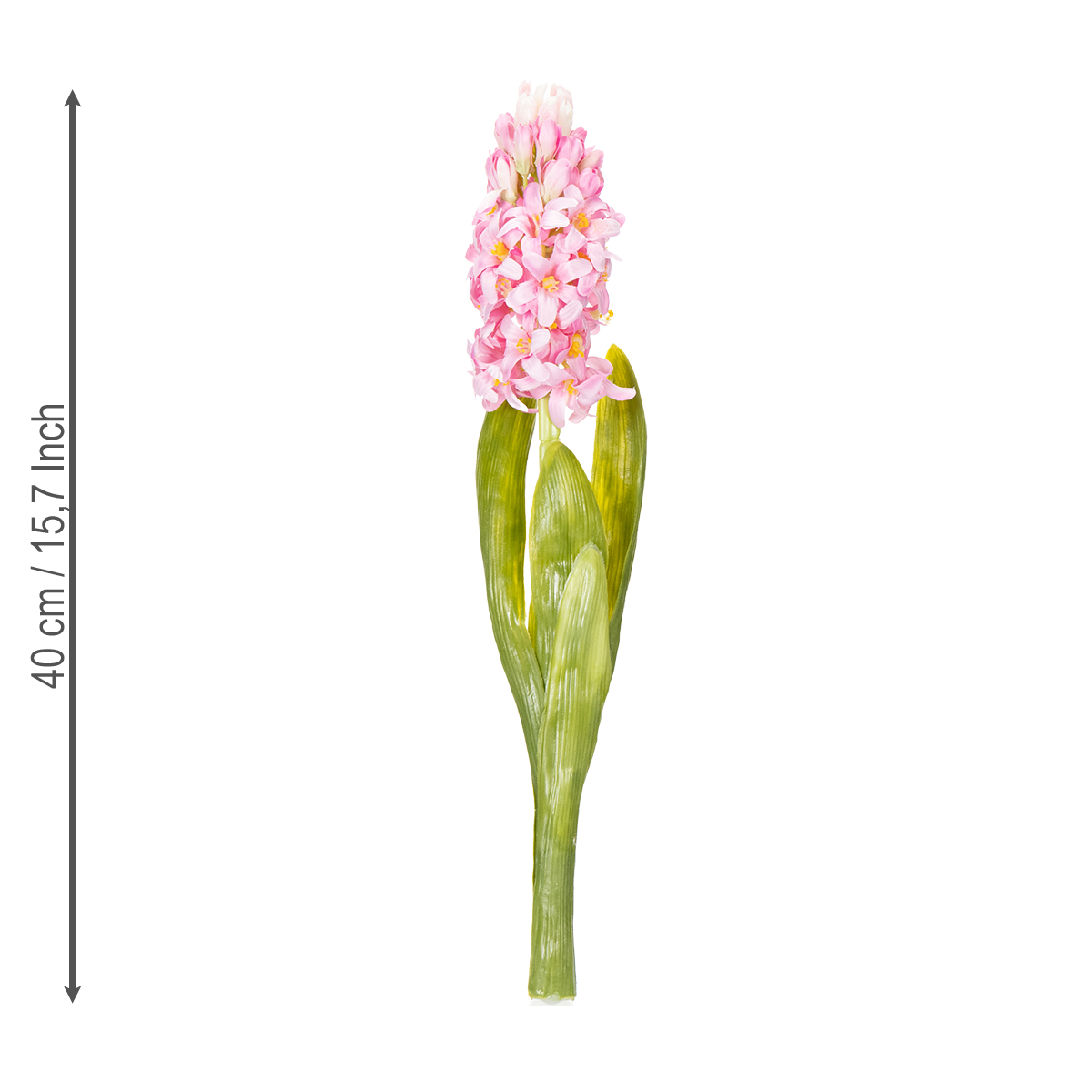 Różowy hiacynt z efektem real touch wykonany jest z tworzywa sztucznego i ma całkowitą wysokość około 40 centymetrów. Średnica kwiatka to około 7 centymetrów.
