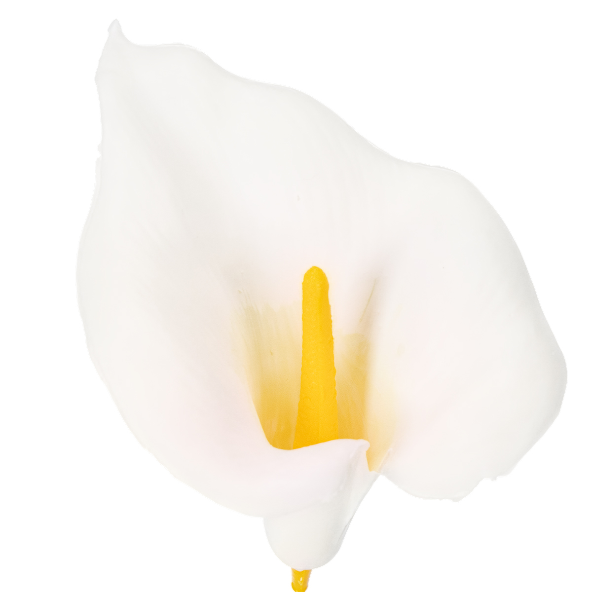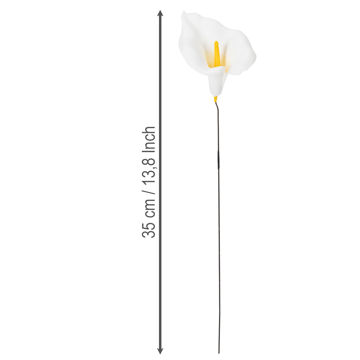 Mała kalla na druciku w kolorze białym dostarczana jest w woreczku 50 szt. Całkowita długość każdego sztucznego kalla bagiennego wynosi około 35 centymetrów, przy czym brązowy i zginany metalowy drut mierzy około 27 centymetrów długości. Biały kwiatostan ma około 10 centymetrów długości, a w jego centrum znajduje się bardzo ładnie imitowany żółty pyłek, a otaczający go lejek ma również lekko żółtawy kolor.
