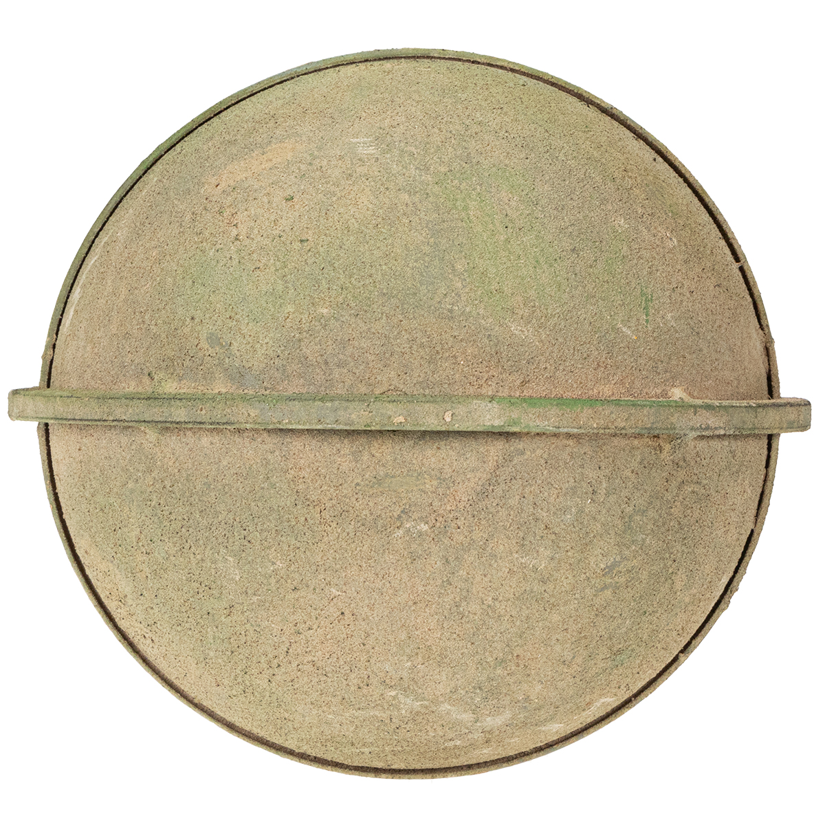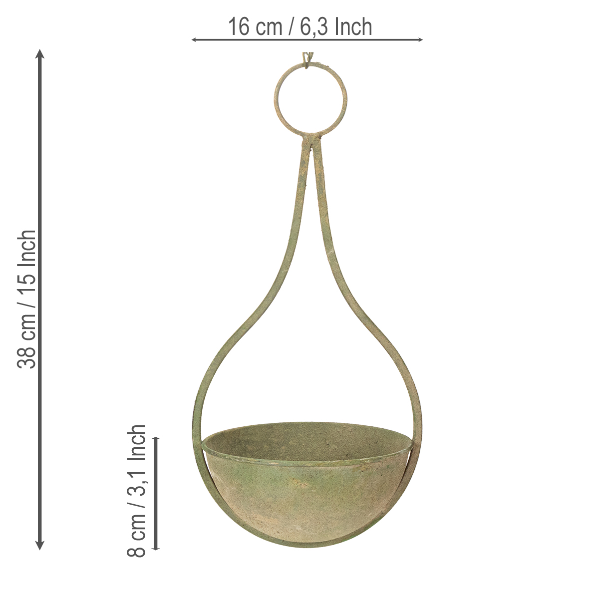 Metalowy wiszący kosz składa się z okrągłej miski, która jest podtrzymywana przez okrągły łuk, który zbiega się ku górze.
