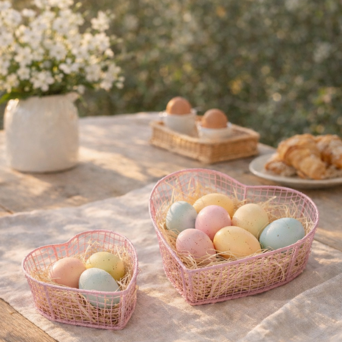 Stwórz romantyczną, a zarazem uporządkowaną atmosferę dzięki tym pięknym drucianym koszykom w kształcie serca. Niezależnie od tego, czy będą służyć jako dekoracja stołu, do przechowywania drobiazgów, czy jako stylowy zestaw prezentowy, te metalowe koszyki w kształcie serca wniosą miłość i porządek do Twojego domu. Wykonane z wytrzymałego metalu, koszyki są dostępne w delikatnych odcieniach różu i fioletu. Idealnie nadają się do salonów lub zacisznych przestrzeni na zewnątrz i stanowią idealny wybór do romantycznej dekoracji stołu na specjalne okazje, takie jak wesela, Walentynki czy urodziny.