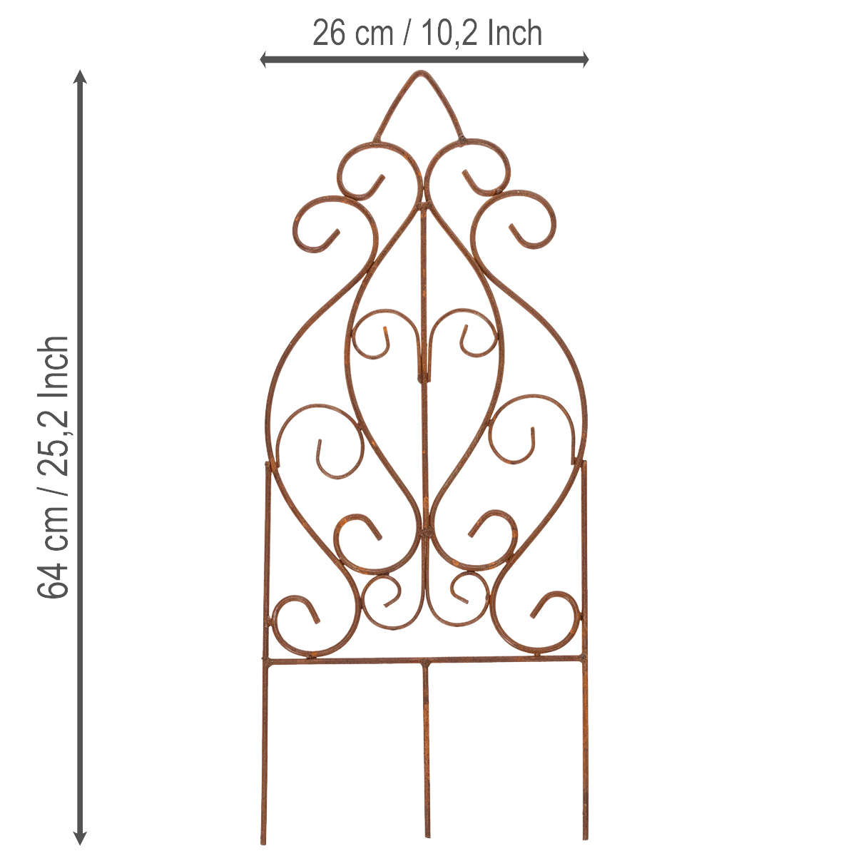 Szczególnie praktyczna: kratka nie wymaga skomplikowanej konserwacji. Delikatne przetarcie wilgotną ściereczką wystarczy, aby zachować naturalne piękno metalu. Nadaje się również do zadaszonych miejsc na zewnątrz i zachwyca trwałością. Można ją dowolnie łączyć z innymi elementami dekoracyjnymi, takimi jak wazony, wieńce czy figurki ogrodowe, aby dopełnić swoją osobistą ogrodową oazę.