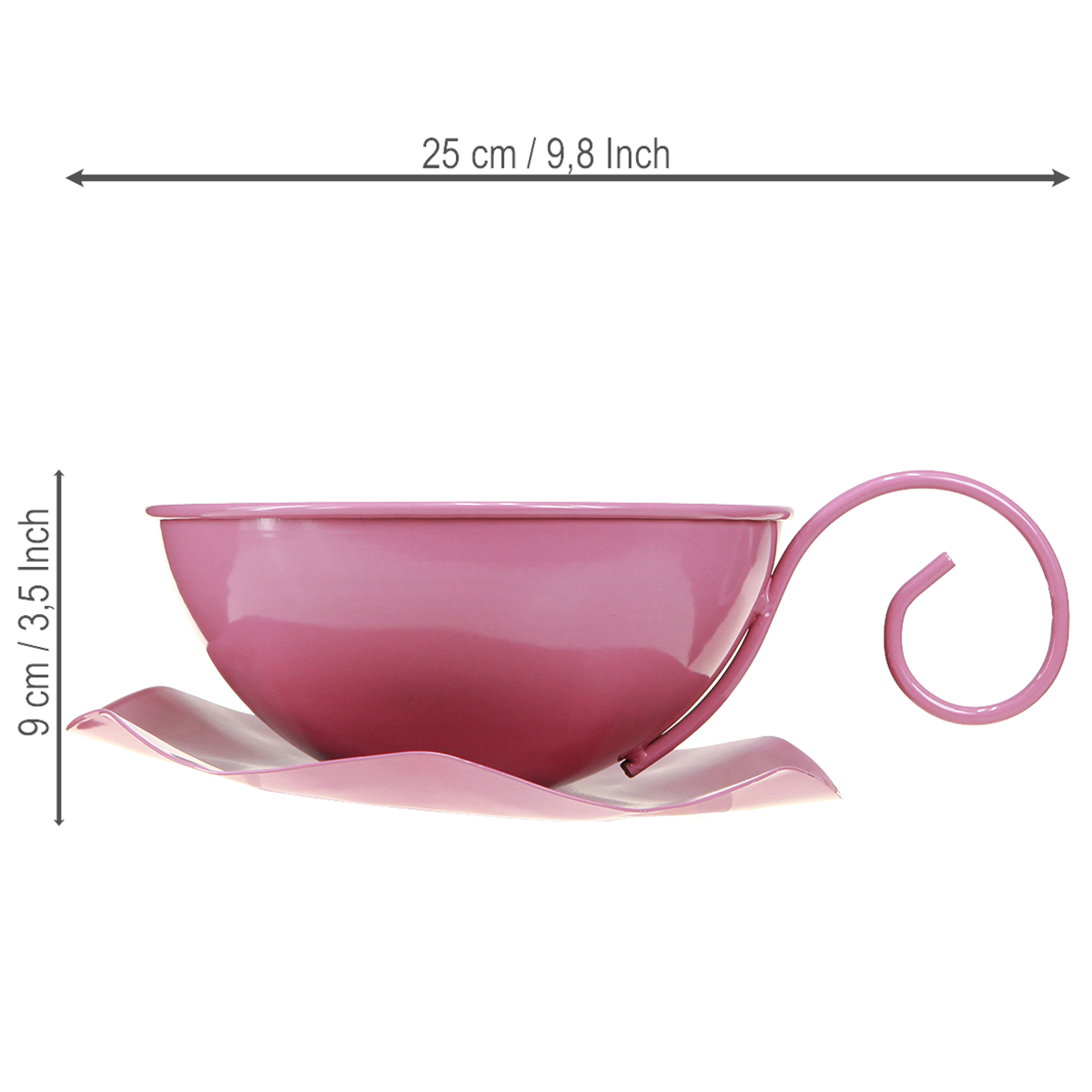 Nasz ozdobny kubek w kolorze różowym to prawdziwa atrakcja w każdym domu. Metalowy kubek o średnicy około 16 cm i wysokości około 9 cm nadaje się zarówno do zastosowań dekoracyjnych, jak i funkcjonalnych. Powierzchnia pomalowana na pastelowy róż przyciąga uwagę wszystkich i tworzy wesołą, zachęcającą atmosferę. Zakrzywiony uchwyt i spodek w kształcie kwiatu nadają filiżance zabawny, a jednocześnie nowoczesny charakter. Dzięki przymocowaniu filiżanki do spodka ta metalowa dekoracja doskonale nadaje się do zaprezentowania na świątecznym stole lub na parapecie.
