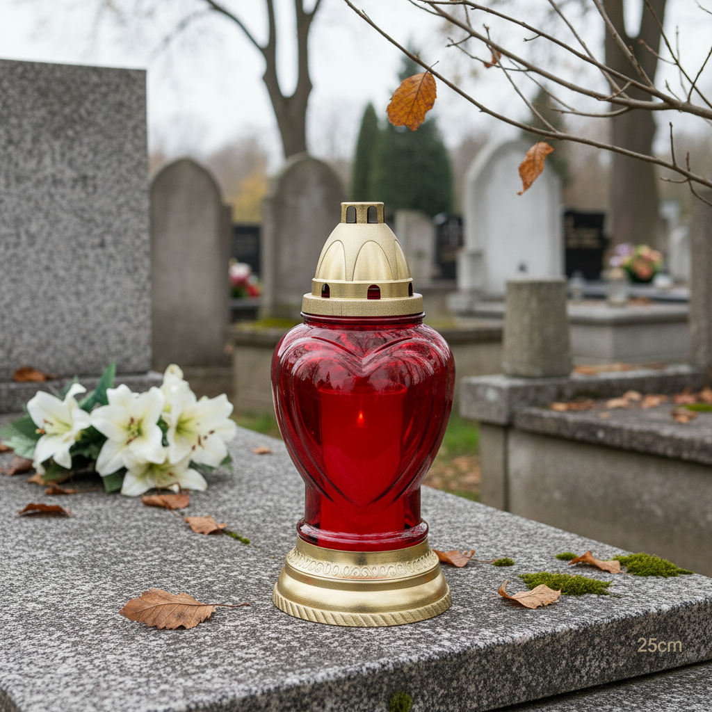 Ta szklana lampa grobowa, ozdobiona sercem, jest atrakcyjnym światłem pamiątkowym. Posiadająca kopulastą podstawę i pokrywę, czerwona i złota lampa grobowa jest szczególnie dekoracyjna.