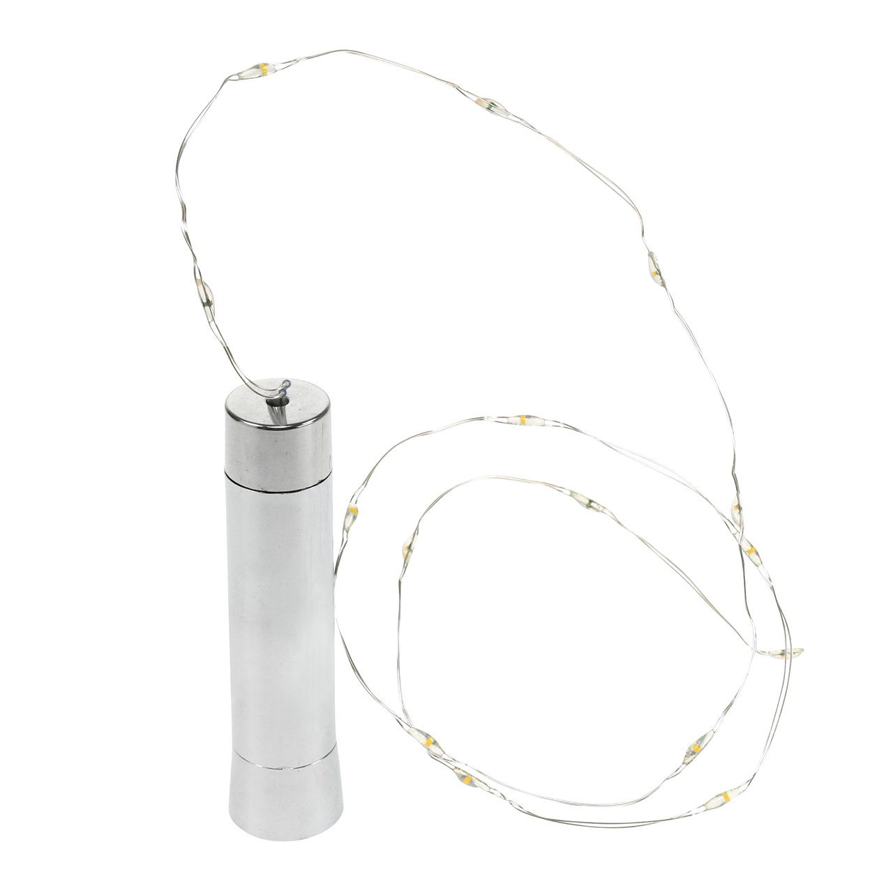 Lampa butelkowa LED w kolorze ciepłej bieli ma całkowitą długość około 82 centymetrów z zamknięciem. Na łańcuchu świetlnym o długości około 73 centymetrów znajduje się w sumie 15 małych diod LED. Srebrne zamknięcie ma średnicę około 2 centymetrów u góry i lekko zwęża się u dołu, dzięki czemu pasuje na przykład do szyjki butelki wina. Do lampek Bottlelights potrzebna jest dodatkowa bateria AA.