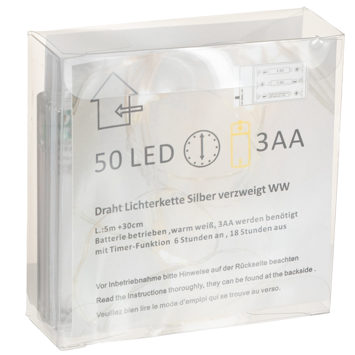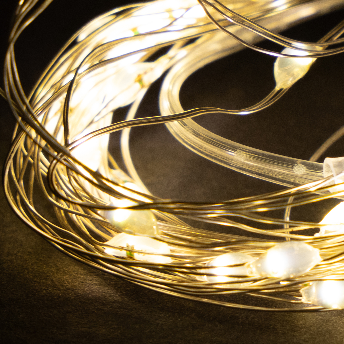Ten 5-metrowy łańcuch świetlny LED, zasilany bateriami i emitujący ciepłe, białe światło, wymaga jedynie 3 baterii AA do oświetlenia 50 diod LED, rozmieszczonych w odstępach 10 centymetrów. Przewód łączący baterie z pierwszą diodą LED ma długość 30 centymetrów.