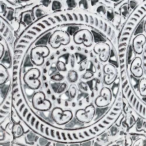Lampion w kolorze białym z ornamentami ma płaskie dno, dzięki któremu całość możesz bezpiecznie i stabilnie postawić na dowolnej płaskiej powierzchni. Latarnia ma wysokość około 13 centymetrów i średnicę około 12 centymetrów. Otwór ma średnicę około 8 centymetrów.