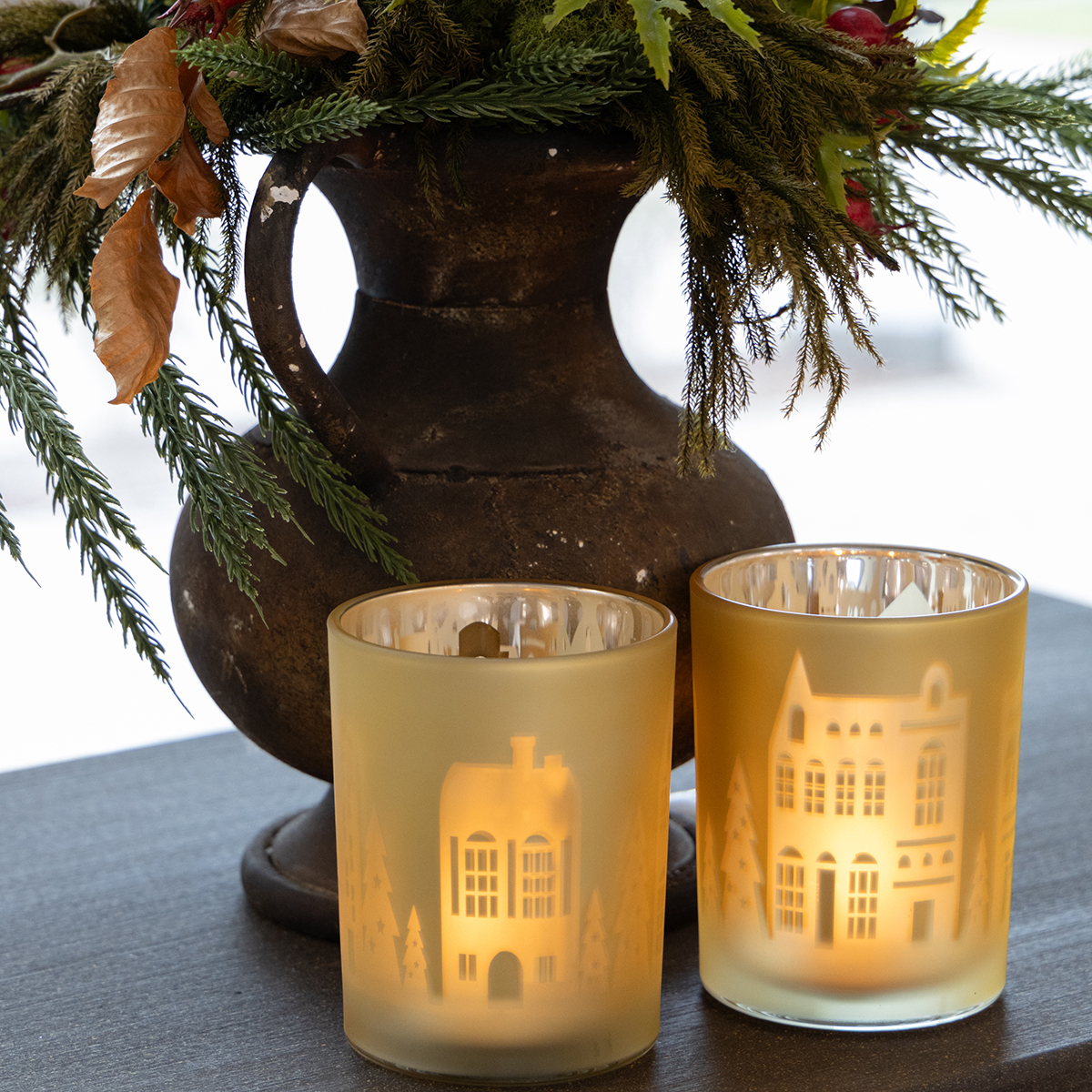 Latarnia szklana srebrno-złota sylwetka miasta wys. 12,5 cm 4 szt.