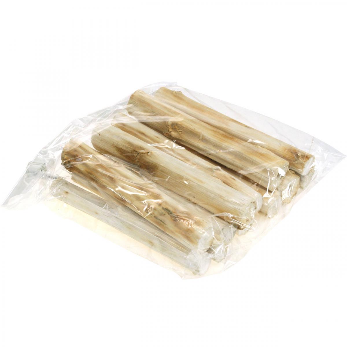 Możesz stworzyć orzeźwiające nakrycie stołu, a także rozjaśnić swoje rośliny doniczkowe za pomocą tej eleganckiej białej łodygi słonecznika! Ta naturalna dekoracja składa się z obranych, oczyszczonych i wysuszonych łodyg słonecznika, zwanego również Helianthus annuus.Możesz też sam zrobić ładny dzwonek wietrzny, jeśli pokroisz patyki na różne rozmiary i powiesisz je obok siebie. Albo wieszasz łodygi słonecznika jedna pod drugą i masz piękny drewniany łańcuszek, który zdobi ościeżnicę. Jeśli masz palmy pokojowe w swoim mieszkaniu, możesz wykorzystać łodygi słonecznika jako ozdobę doniczki i położyć je luźno na kulkach roślin i przykryć nimi ziemię doniczkową. Ale drewniane patyczki wyglądają również bardzo ładnie, gdy są umieszczone bezpośrednio w ziemi i mogą być używane jako przegroda w grządce warzywnej lub kwiatowej w ogrodzie.