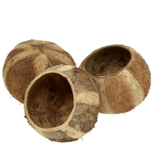 Z tym zestawem 5 łupin orzecha kokosowego w kolorze naturalnym odkryłeś idealną podstawę dla modnej dekoracji dżungli! Owoce palmy kokosowej (Cocos nucifera) zostały otwarte u góry, oczyszczone, a następnie częściowo uwolnione od skóry, dzięki czemu mają ciekawy, pasiasty wygląd. Górna krawędź została zeszlifowana.Odnosi się to również do dna, dzięki czemu powstał niewielki ślad: Możesz więc wykorzystać kubki kokosowe wypełnione np. lataballami lub żwirem perłowym również jako stojącą dekorację! Wprawdzie naturalne produkty nie zawsze stoją zupełnie prosto, w zależności od tego, jak został oszlifowany spód, ale to tylko podkreśla naturalność modnych elementów dekoracyjnych. Jeśli wydrążysz łupiny orzecha kokosowego z dwóch stron i wyposażysz je w rustykalną wstążkę jutową lub wełniany sznurek, masz również możliwość zawieszenia naturalnych artykułów na suficie lub na wieńcu, który wcześniej ozdobiłeś tropikalnymi liśćmi dekoracyjnymi. Taki egzotyczny przyciągacz wzroku możesz powiesić w witrynie swojego sklepu, ale także w barze czy restauracji, które są już tropikalnie udekorowane.