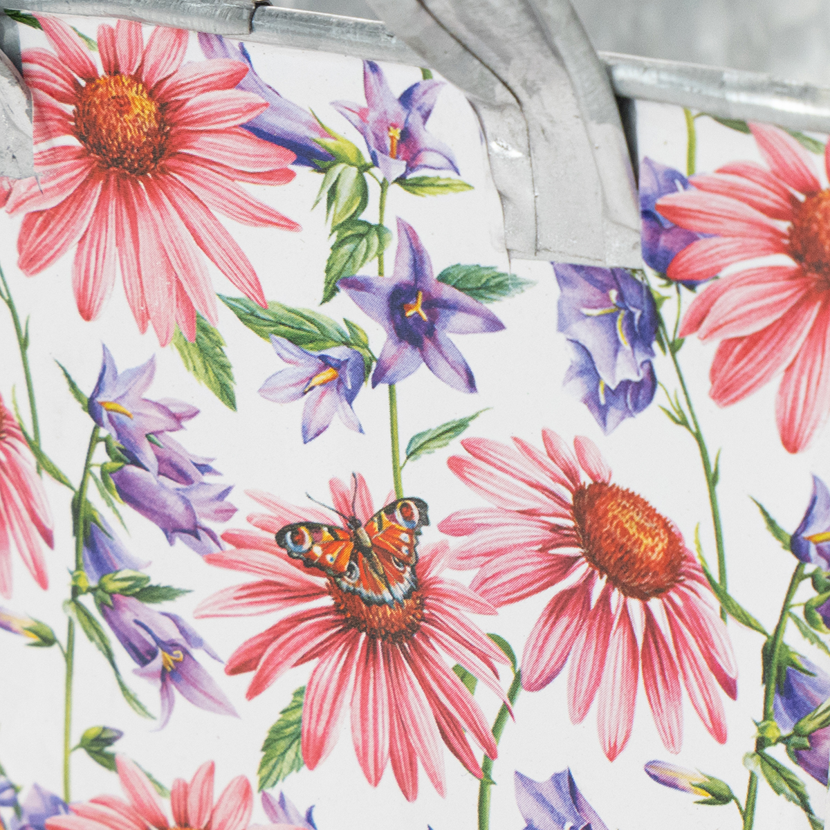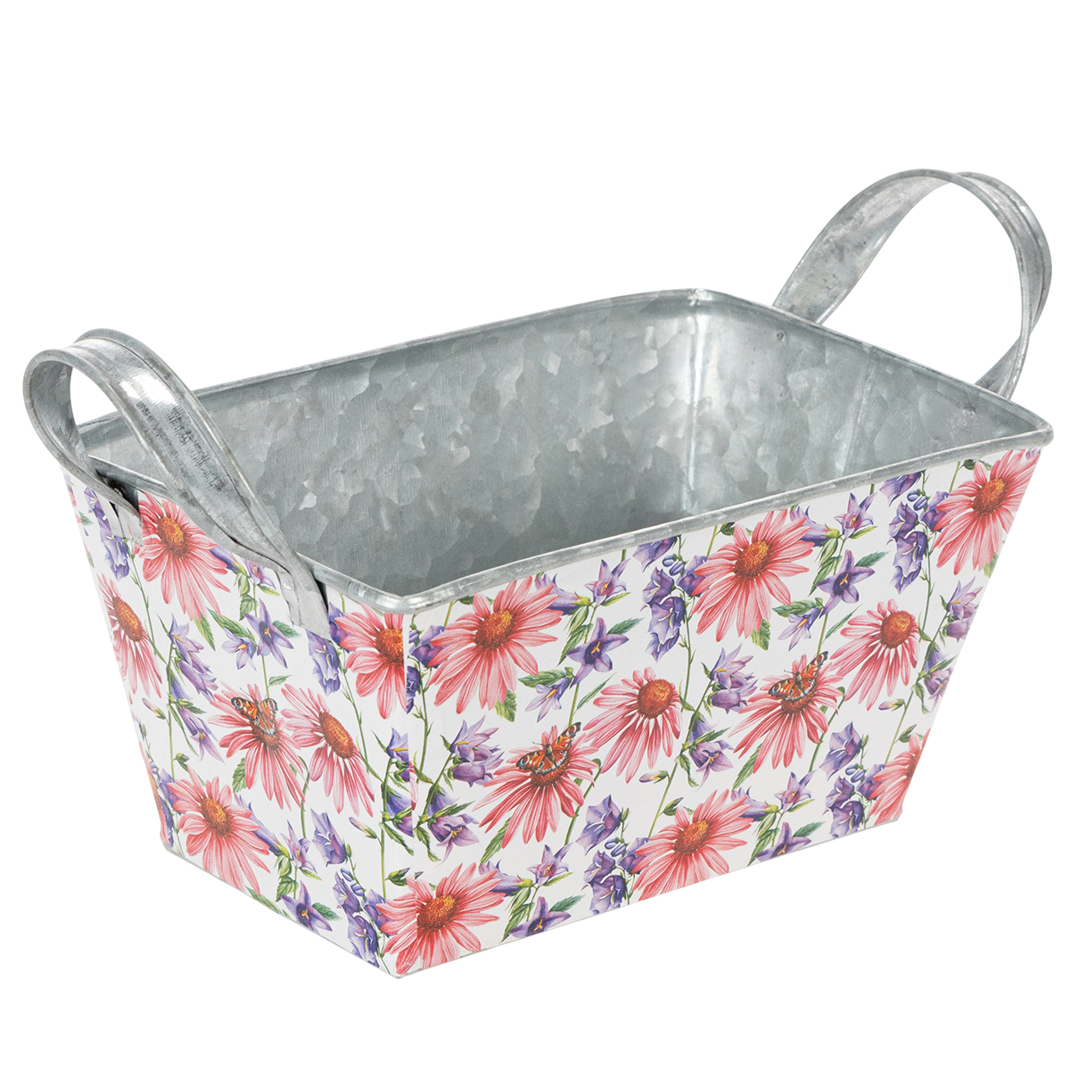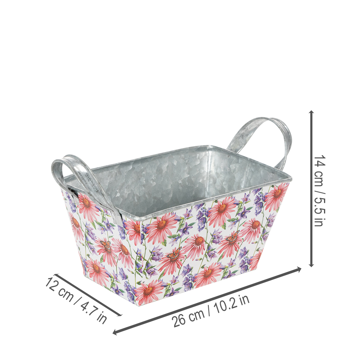 Różowe i liliowe wiosenne kwiaty na białym tle tworzą urozmaiconą i optymistyczną oprawę. Motyw kwiatowy został nadrukowany na wytrzymałej folii, która z kolei przykleja się do cynkowego naczynia. W ten sposób wnętrze z cynkiem w kolorze srebrnym tworzy mocny kontrast w wiosennej dekoracji.