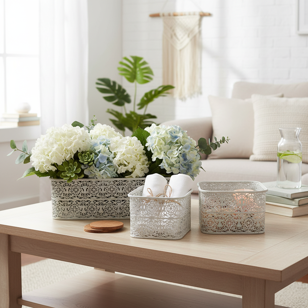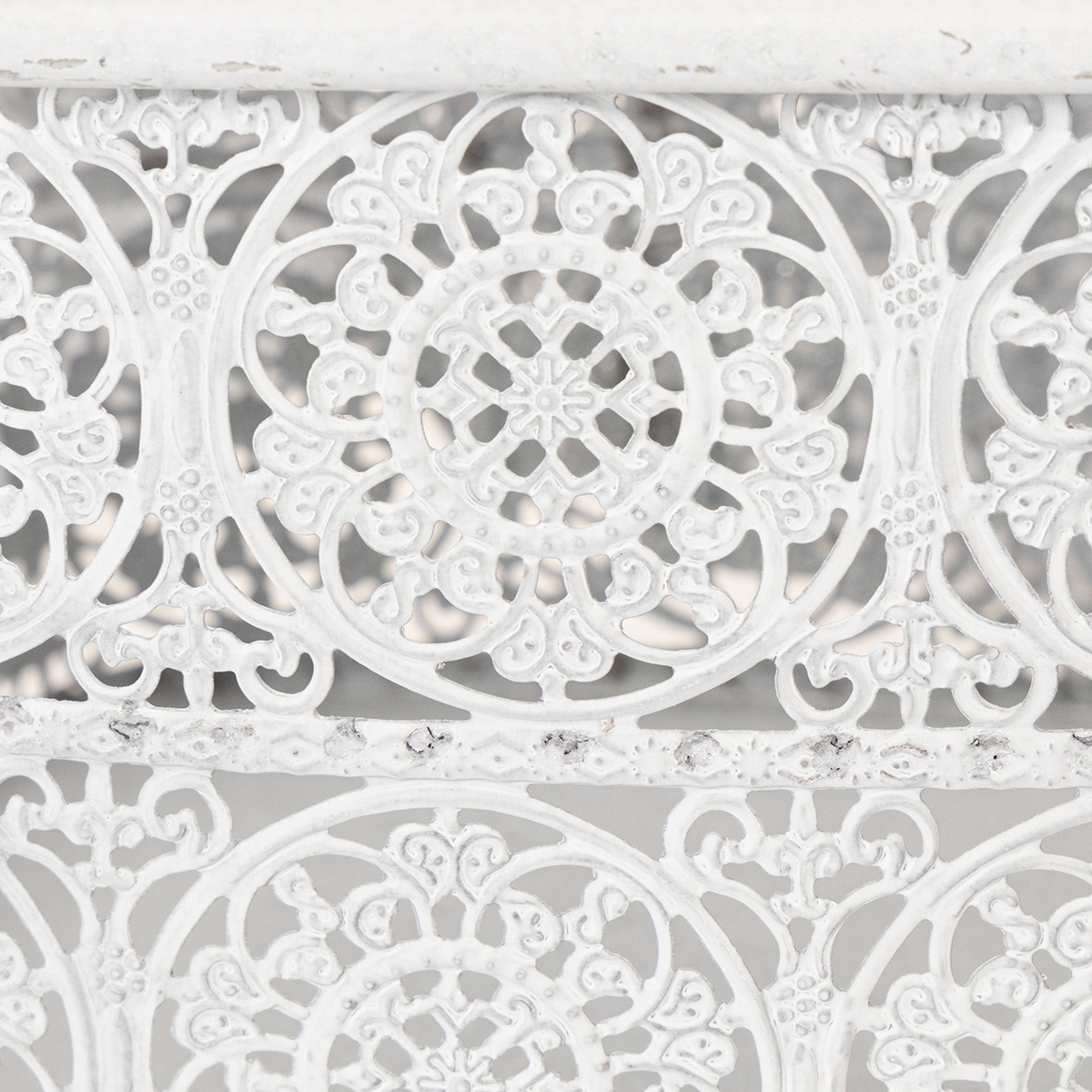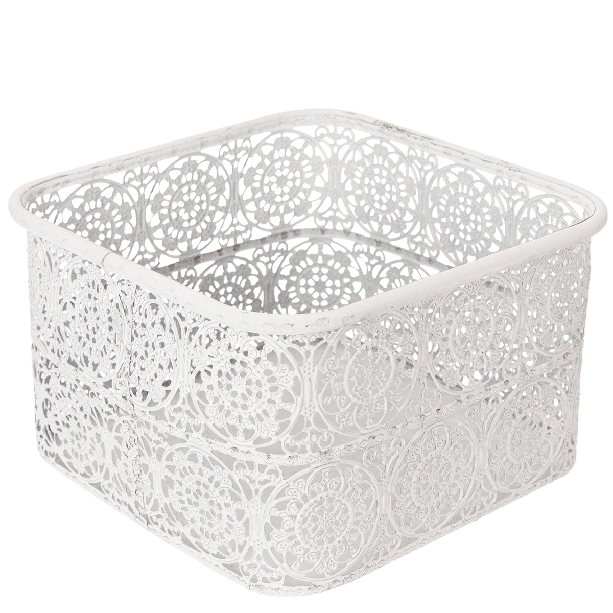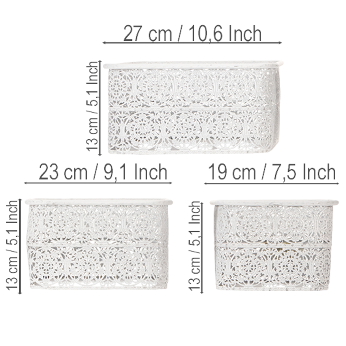 Te metalowe miski z koronkowym wzorem są dostępne w praktycznym zestawie 3 sztuk w różnych rozmiarach. Kanciaste naczynia ozdobne są zaprojektowane w modnym stylu shabby chic, dzięki czemu srebro metalu prześwituje miejscami przez białą farbę.