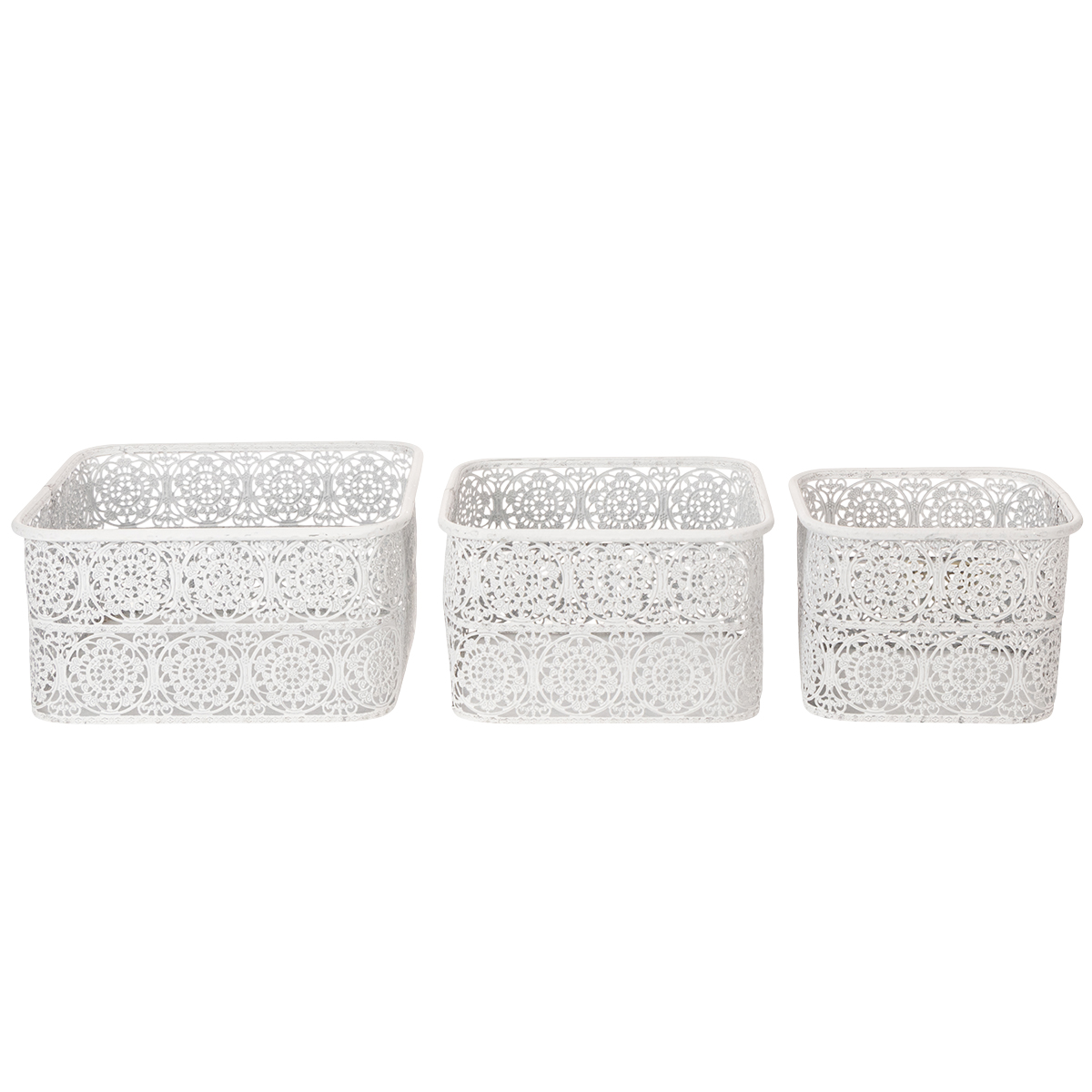 Metalowe miski z koronkowym wzorem, pojemnik dekoracyjny, kwadratowy, styl shabby chic, biały, 27/23/19 cm, wys. 13,5 cm, zestaw 3 szt.
