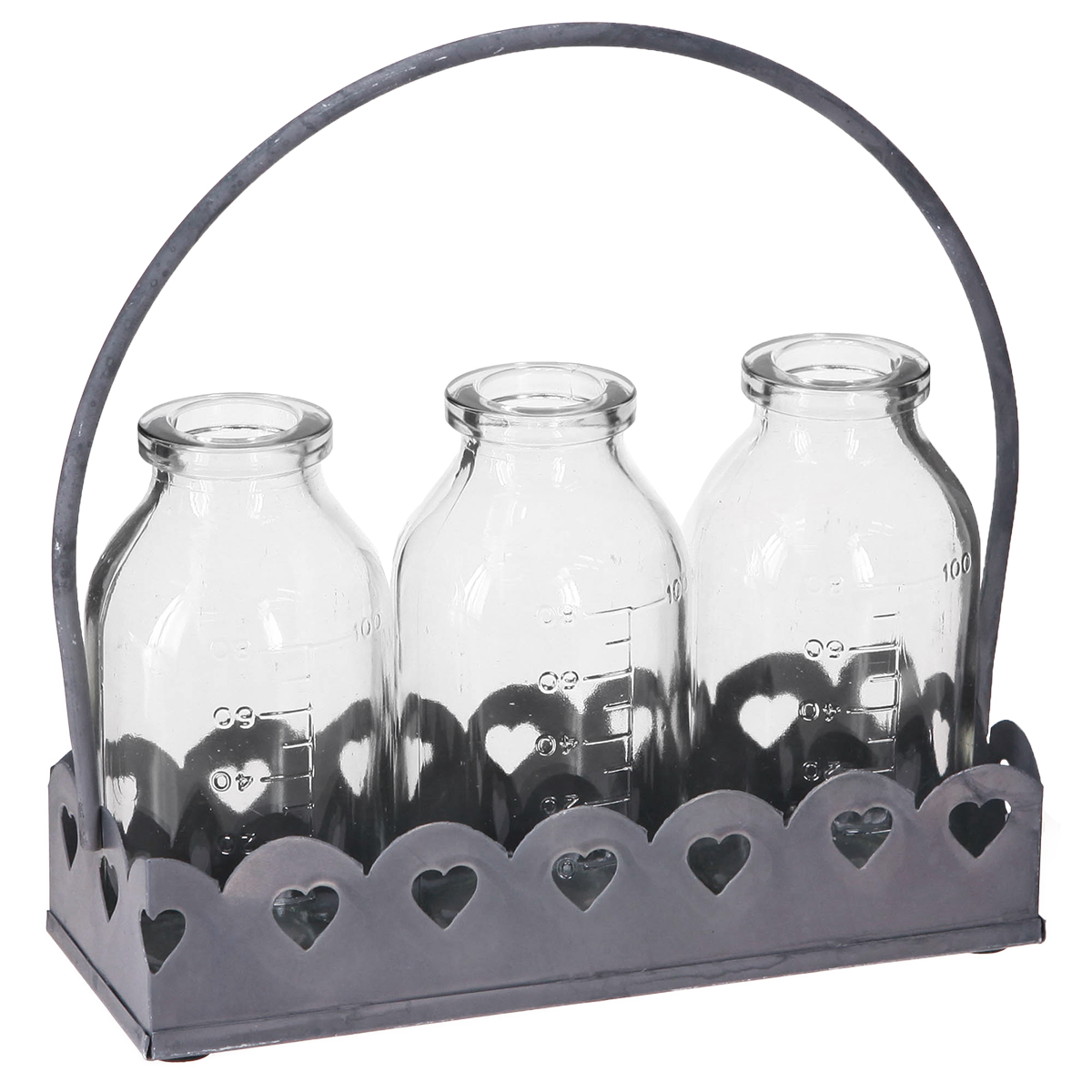 Odkryj magiczny urok małych dekoracji butelkowych ustawionych w formie wazonów na tacy. Te urocze dekoracyjne butelki doskonale nadadzą Twojemu wnętrzu odrobinę nostalgii. Każdy z trzech szklanych wazonów przypomina antyczne butelki apteczne i umieszczono go na solidnej, szarej metalowej tacy z wyciętymi motywami serc. Ten detal w stylu retro dodaje aranżacji romantycznego akcentu, dzięki czemu idealnie nadaje się do dekoracji weselnych, przytulnej dekoracji stołu lub jako pomysł na prezent. Wymiary butelek pozwalają na różnorodne wykorzystanie: od szybkiego sadzenia małych kompozycji kwiatowych po przechowywanie ziół lub materiałów do rękodzieła.