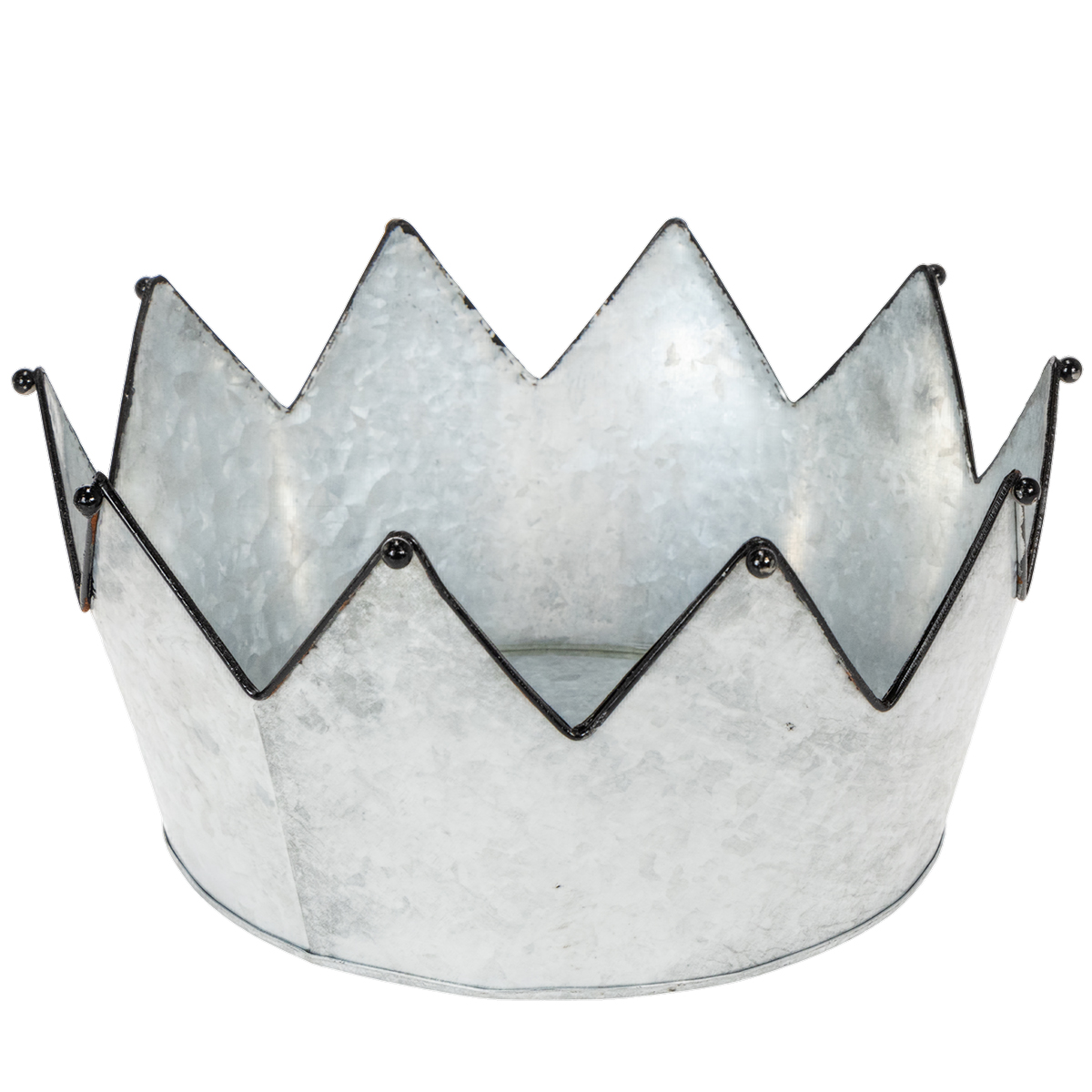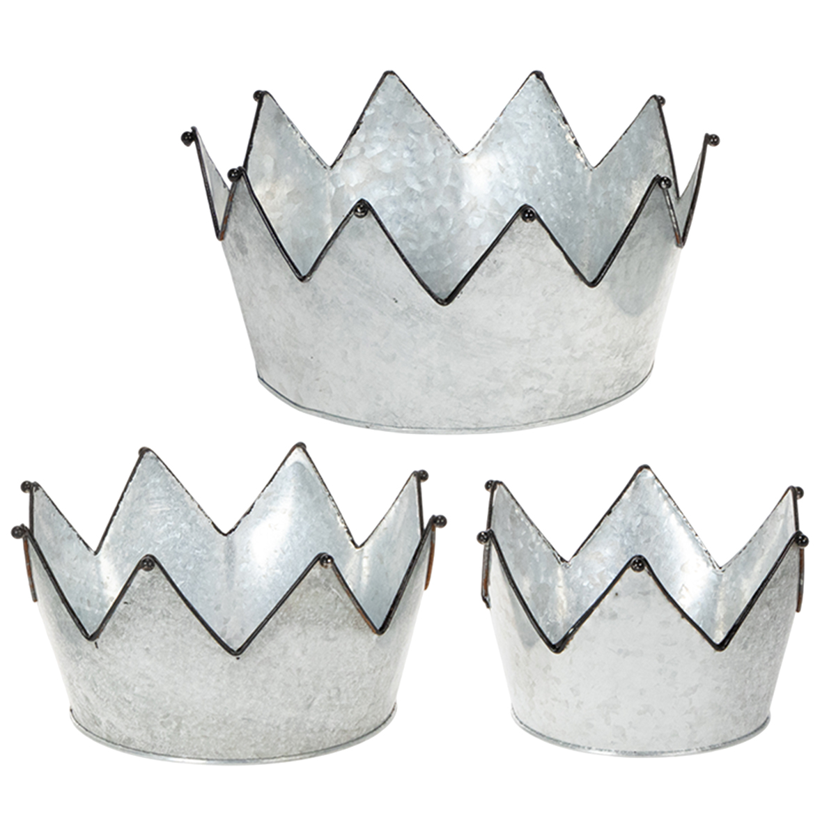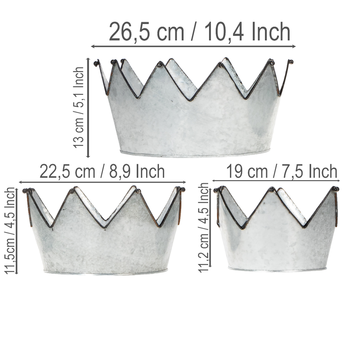 Trzy metalowe miski wykonane z cynku są wykonane w różnych rozmiarach. Ich wspólną cechą jest czarna obwódka wokół kolców, ozdobiona małą ozdobną kulką. Kula jest również czarna, aby pasowała do dekoracji vintage. Czarna ramka z dekoracją uświadamia wszystkim: są tu trzy korony - gotowe do wypełnienia lub po prostu do nałożenia.