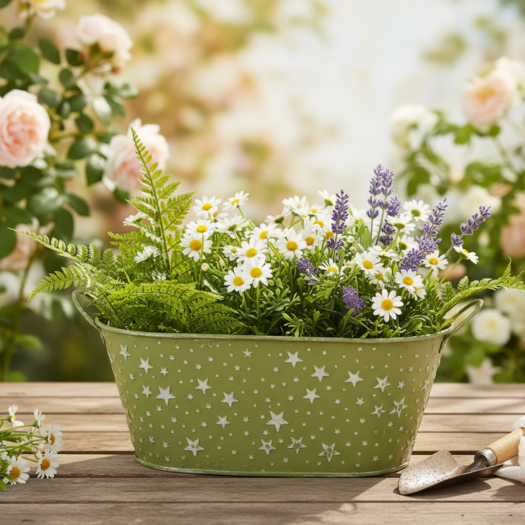 Witamy w świecie pełnym marzeń o dekoracjach! Niezależnie od tego, czy używana jest jako doniczka na boże narodzenie, donica na rośliny świąteczne, czy też elegancka miska na kompozycje kwiatowe, ta miska w kolorze mchu z wytłoczonymi gwiazdami jest idealnym wyborem dla dekoratorów i kwiaciarni dbających o szczegóły. Częściowo zużyta farba na gwiazdach i półprzezroczysty metal tworzą wyjątkową świąteczną ozdobną doniczkę, której nie powinno zabraknąć w żadnym świątecznie udekorowanym pomieszczeniu.