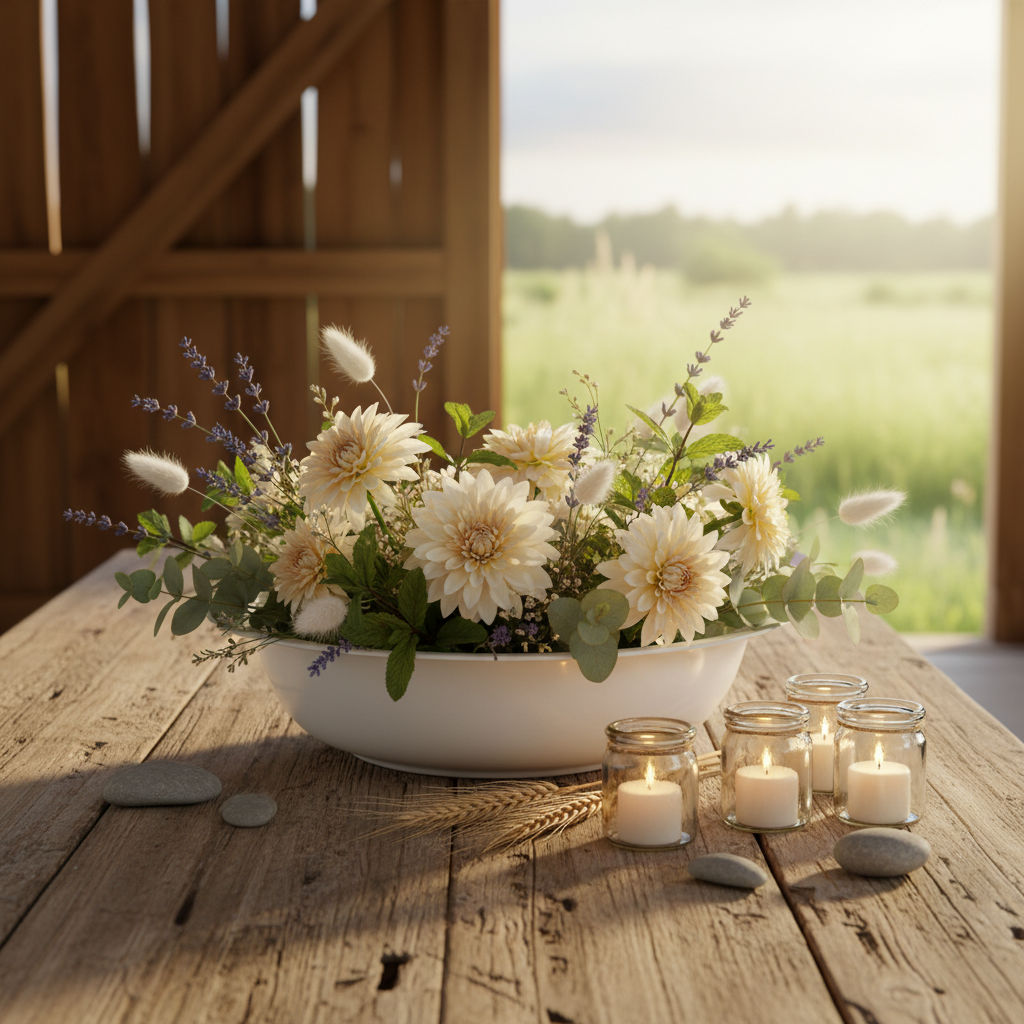 Miska w kolorze białym sprawdzi się jako baza do suchych dekoracji o rustykalnym uroku. Miska służy również jako podstawa do wielu innych pomysłów dekoracyjnych z suszonymi kwiatami, piaskiem dekoracyjnym lub żwirem dekoracyjnym.