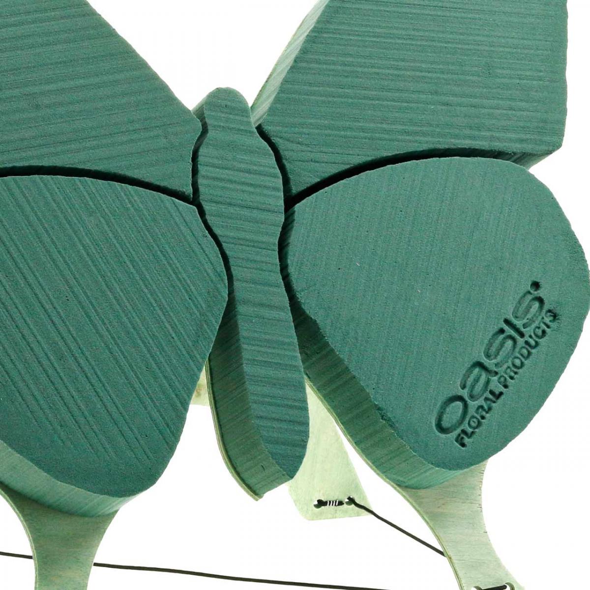 Motyl OASIS® BIOLINE® z drewnianą podstawką ma w przybliżeniu wymiary 56 centymetrów na 40 centymetrów na 6,5 centymetra. Wyposażony jest w linie cięcia. Są to wąskie zagłębienia w piance. Mają one na celu zminimalizowanie wysychania. Po udekorowaniu, motyl dekoracyjny powinien stać w pozycji pionowej przez pewien czas. Dzięki temu woda może spływać, która została wyparta przez łodygi kwiatów.