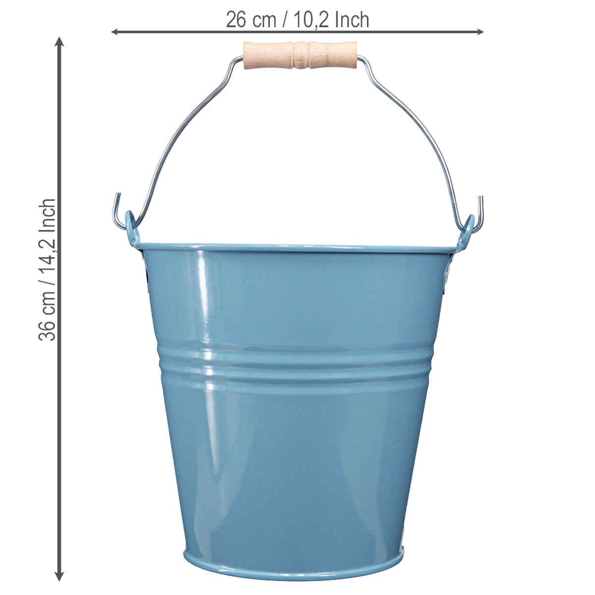 Odkryj urocze ozdobne wiadro w ponadczasowym niebieskim kolorze. Jako doniczka wykonana z metalu zachwyca elegancką lekkością i solidną jakością. Wyposażony w drewniany uchwyt, łączy funkcjonalność z dekoracyjnym wyglądem, idealny do dekoracji wnętrz i na zewnątrz.