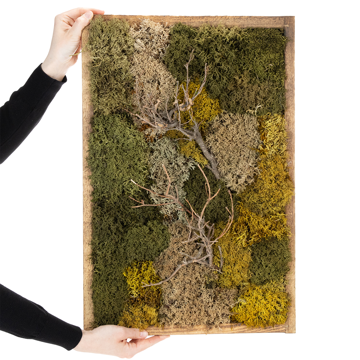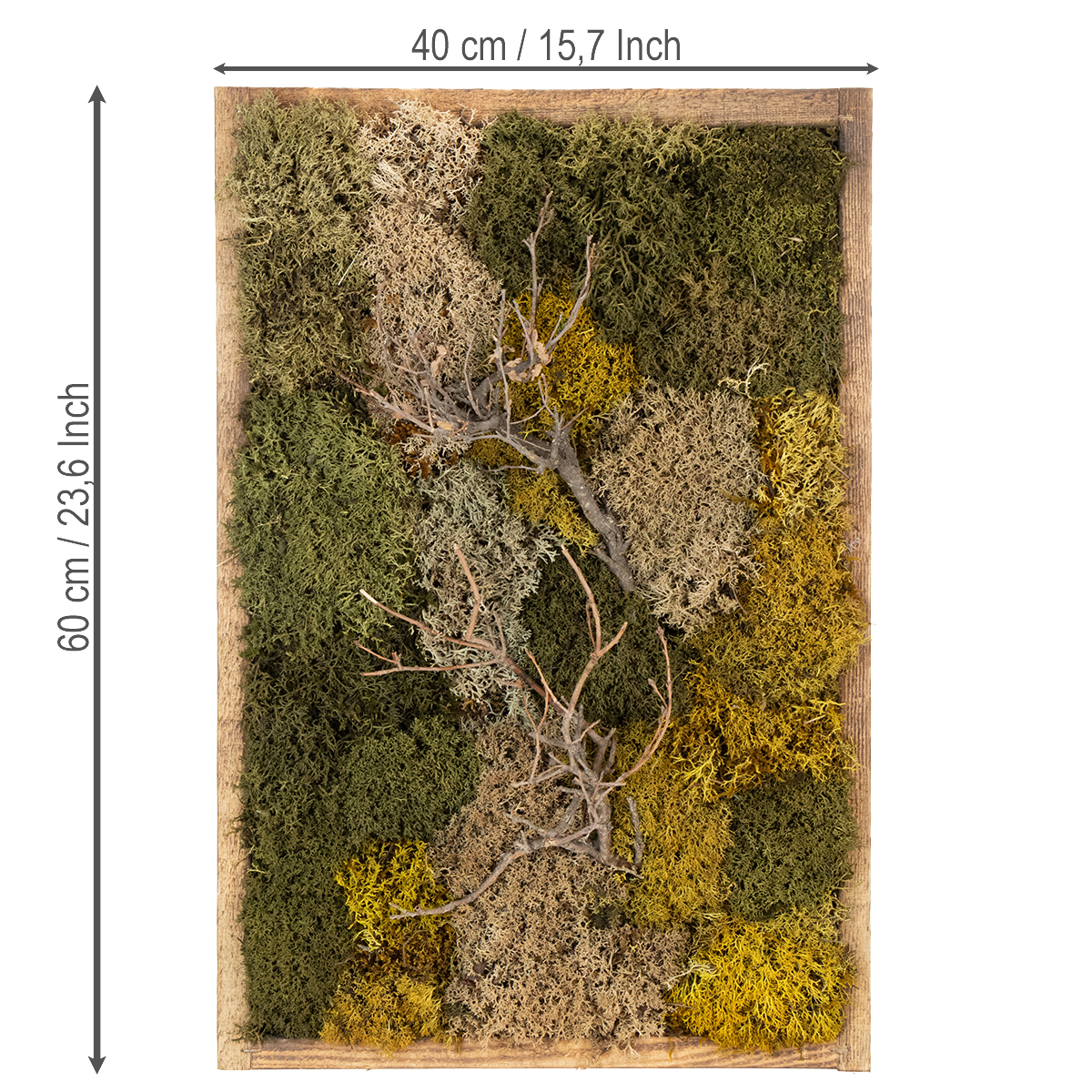 Odkryj naturalne piękno i spokój dzięki naszemu różnorodnemu obrazowi mchu. Prawdziwy, zakonserwowany mech w połączeniu ze starannie wyselekcjonowanymi gałęziami wprowadza harmonijną atmosferę natury bezpośrednio do Twojego domu lub biura.