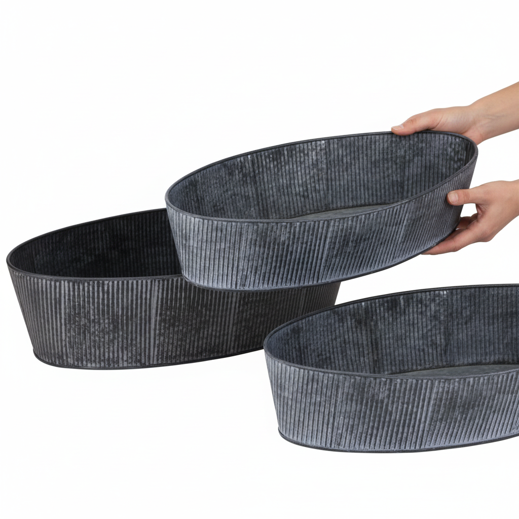 Owalna miska wykonana z metalu w kolorze czarnym łączy w sobie stylową elegancję z czarującą estetyką vintage, która upiększy Twój dom. Niezależnie od tego, czy będzie to przyciągająca wzrok dekoracyjna miska, nostalgiczna dekoracja stołu, czy też rustykalna misa na kwiaty – ten zestaw dwóch składanych metalowych misek otwiera wiele możliwości kreatywnych. Elegancka kolorystyka w kolorze czarnym, spranej szarości oraz delikatne rowki idealnie komponują się z każdym wnętrzem w stylu shabby chic lub industrialnym. Użyj misek jako doniczek na rośliny i dodaj zielony akcent, sadząc w nich rośliny doniczkowe lub zioła. Mniejszy idealnie nadaje się do stylowego przechowywania kluczy lub sukulentów.