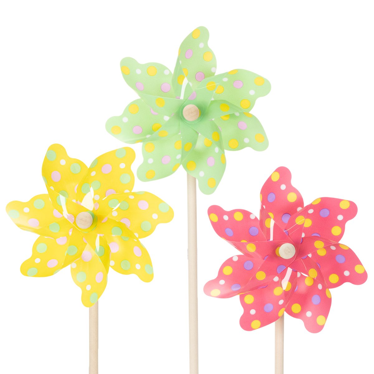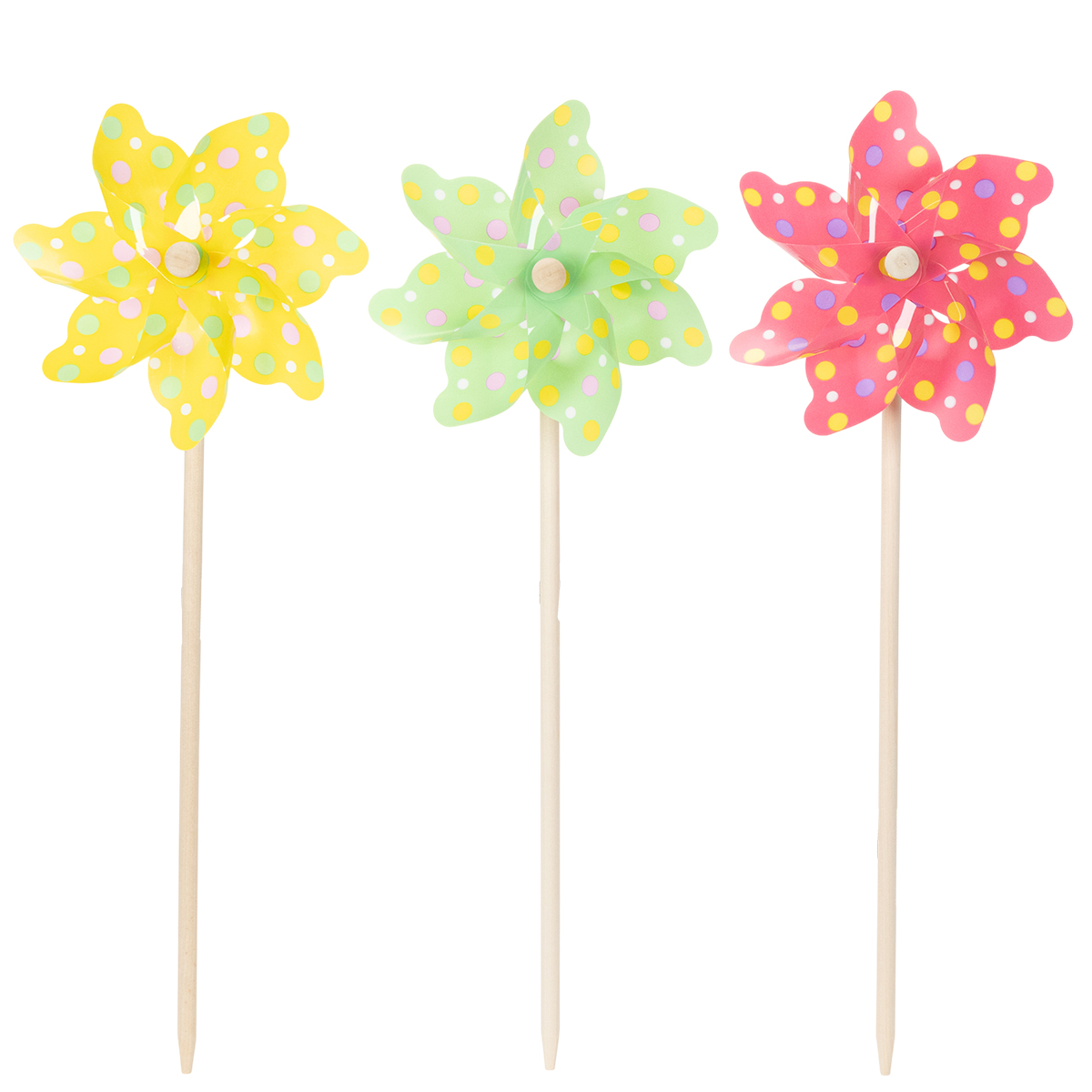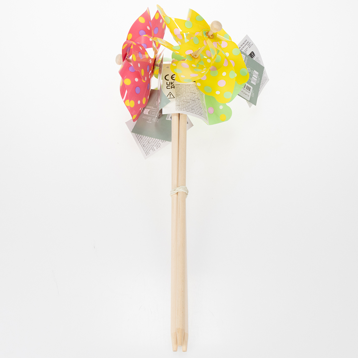 Te wiatraki o całkowitej wysokości 47 cm i średnicy 17 cm idealnie nadają się do umieszczenia wśród kwiatów i roślin. Wytrzymałe tworzywo sztuczne w połączeniu z solidnym drewnianym kołkiem gwarantuje trwałość. A co najważniejsze: otrzymujesz zestaw trzech sztuk, więc możesz puścić wodze fantazji.