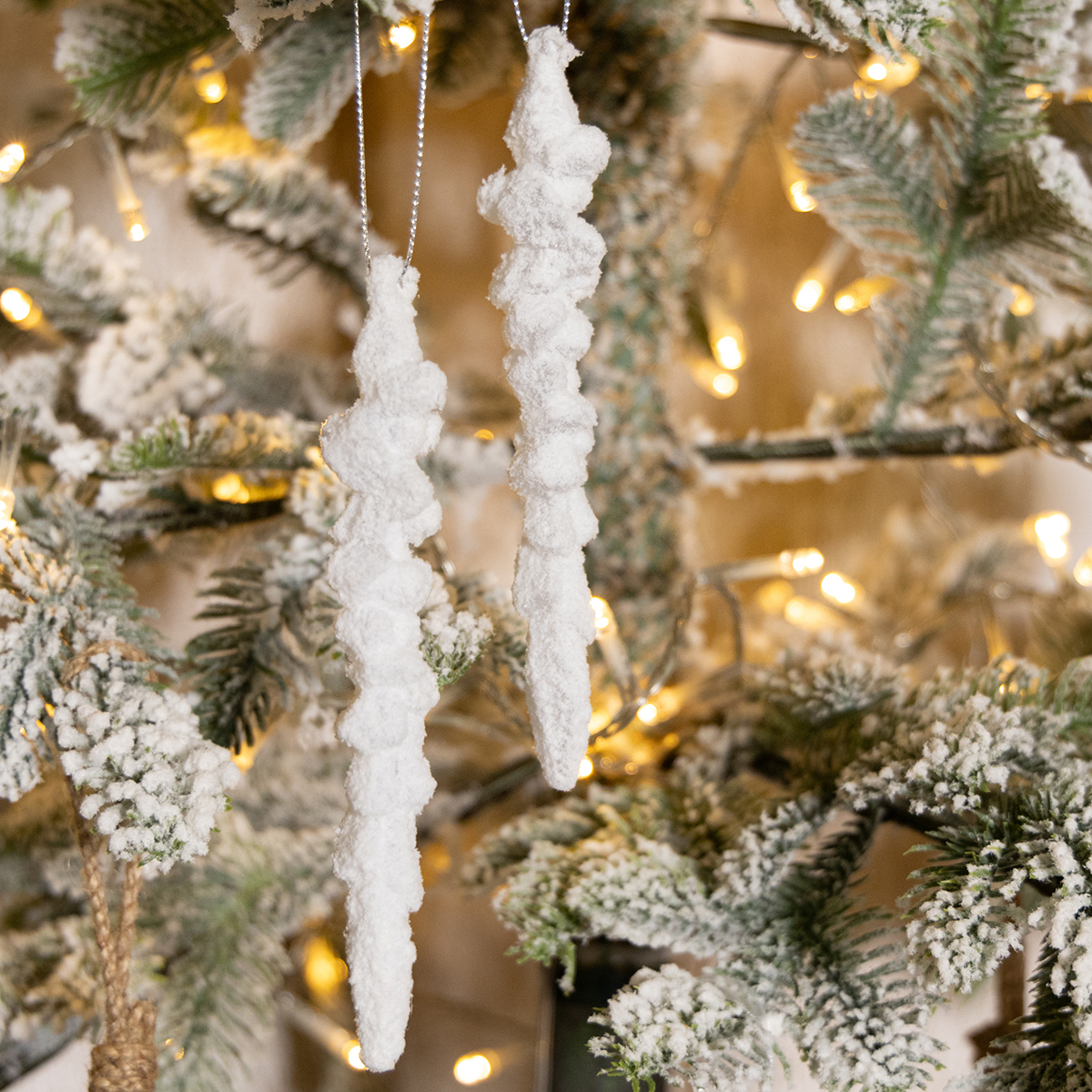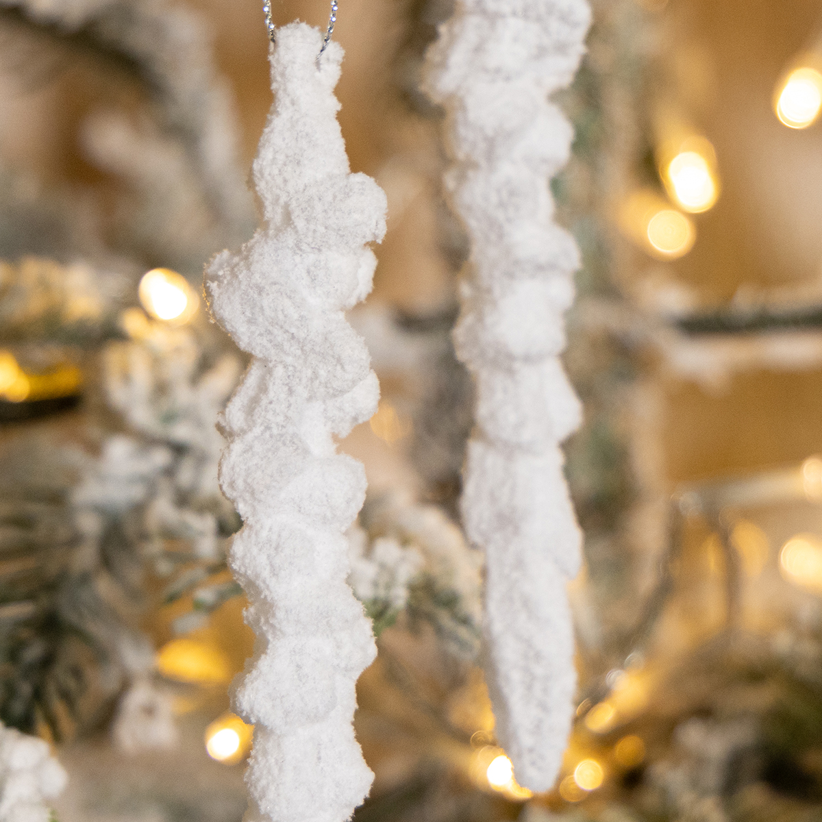 Ośnieżone ozdoby choinkowe w kształcie sopli – biała, zimowa magia w salonie