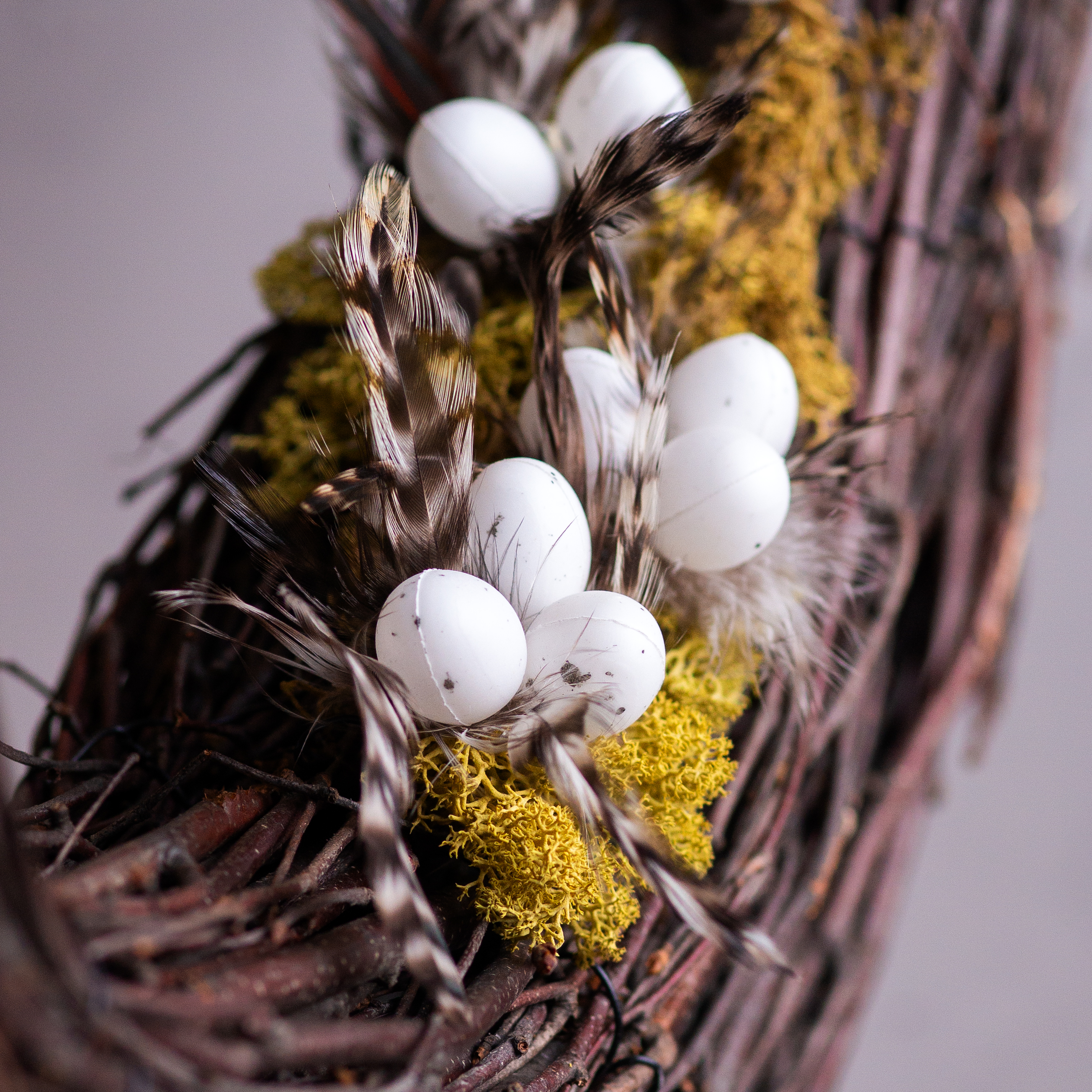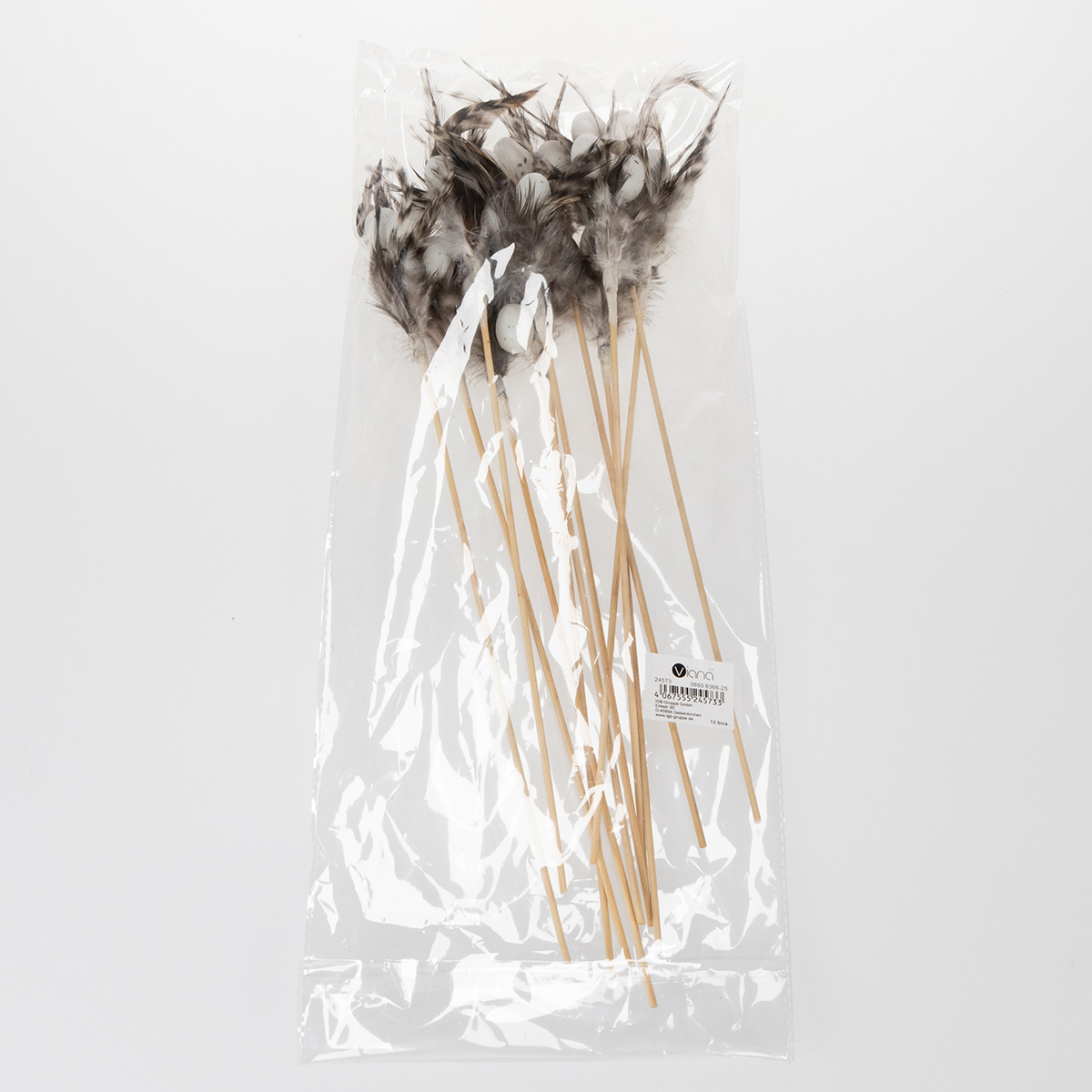- Materiał: Drewniany patyk z naturalnymi piórami i małymi plastikowymi jajkami