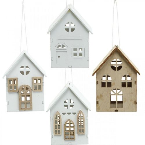Jak w prawdziwym modelu, drewniane domy mają kilka okien i drzwi. Za pomocą tekstylnej wstążki na dachu ozdobne domki można powiesić na choince jako ozdoby choinkowe lub wkomponować je w aranżacje i wieńce w okresie świątecznym.