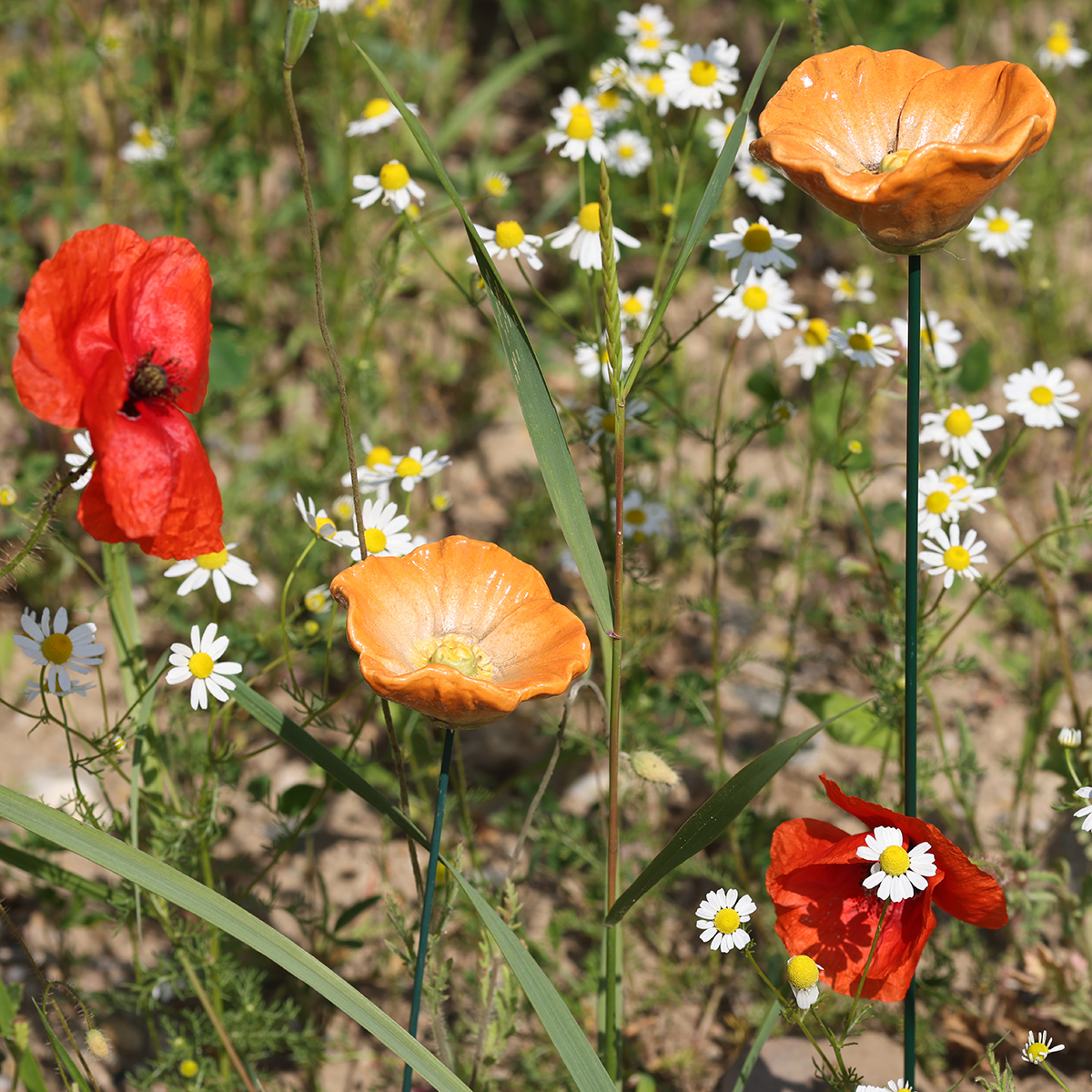 Nasze paliki ogrodowe Poppy Garden łączą atrakcyjny design z najwyższą jakością. Wykonane z precyzyjnie wykończonej ceramiki, zachwycają wysoką jakością wykonania i misternymi detalami. Ciepłe, pomarańczowe i białe odcienie płatków tworzą żywy efekt, rozświetlając każdy ogród. Dzięki ręcznie wykonanemu wyglądowi, paliki emanują kunsztowną naturalnością, która idealnie wpisuje się w aranżację ogrodu w stylu śródziemnomorskim lub rustykalnym. Połącz te kwiaty z zielonymi roślinami lub neutralnymi doniczkami – harmonijnie wkomponują się w całość, jednocześnie tworząc wyrazisty akcent.