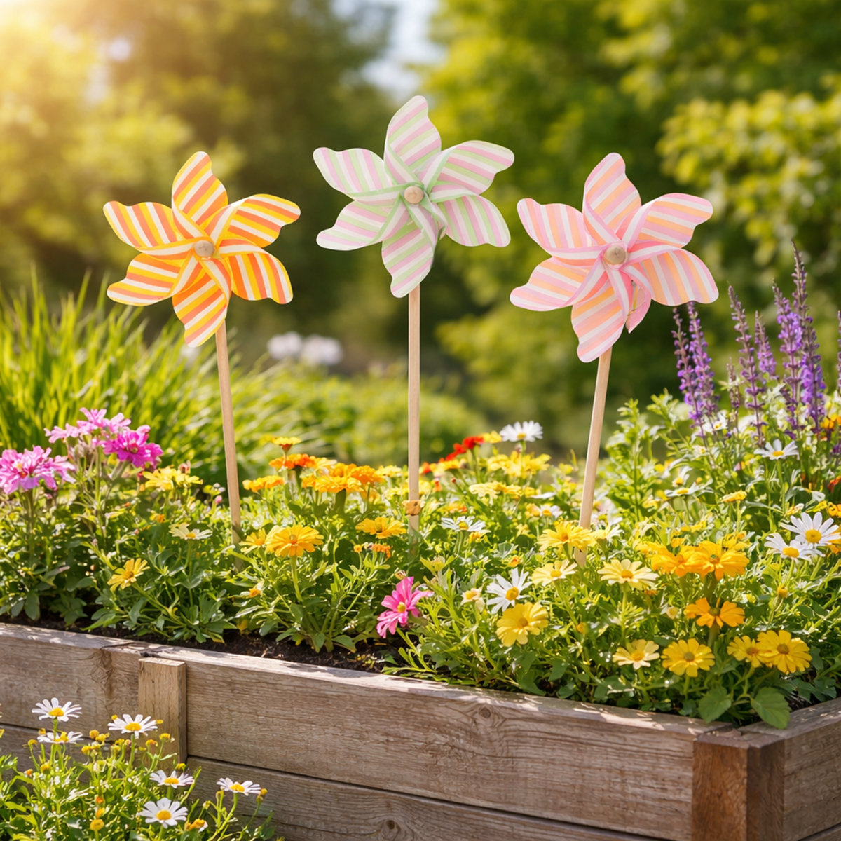 Wskazówka: Połącz wiatraki z innymi dekoracjami ogrodowymi w rustykalnym lub wesołym stylu, takimi jak latarnie, kratki lub małe tabliczki ogrodowe. Stworzy to harmonijny wygląd, łączący atmosferę i styl.