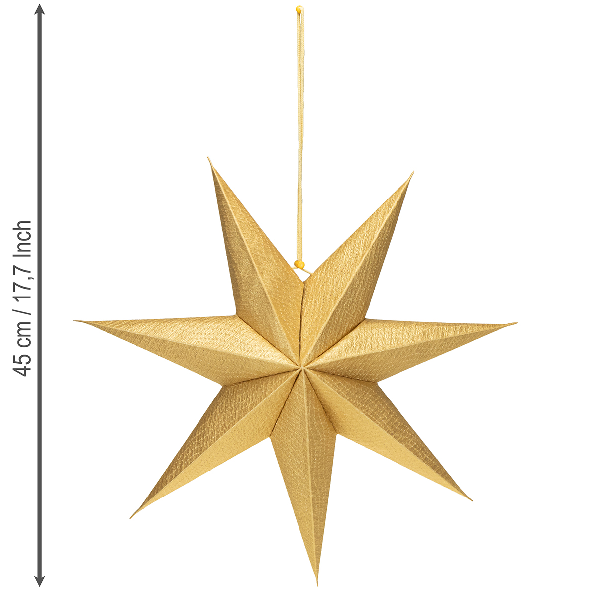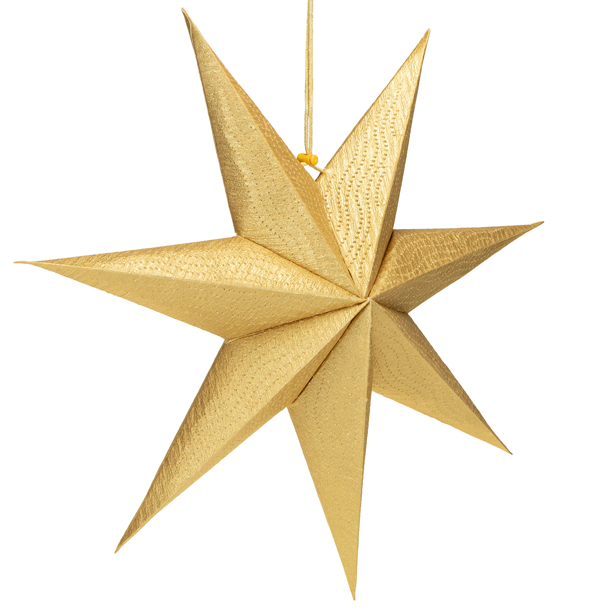Ta złota, papierowa gwiazda bożonarodzeniowa jest nie tylko zachwycająca wizualnie, ale i starannie zaprojektowana. Dzięki imponującemu rozmiarowi 45 cm przyciąga wzrok, pozostając jednocześnie subtelną i elegancką. Złota powłoka pięknie mieni się w świetle, dodając każdemu wnętrzu odrobinę wyrafinowania. Gwiazdki są dostarczane z praktycznym bawełnianym wieszakiem i stoperem, dzięki czemu są niezwykle łatwe w zawieszeniu – bez konieczności skomplikowanego mocowania. Te papierowe gwiazdy nadają się również do użytku ze sztucznym oświetleniem. Wyobraź sobie delikatną, ciepłą poświatę sączącą się przez złoty papier, oświetlającą delikatne wzory. Po prostu magiczne!