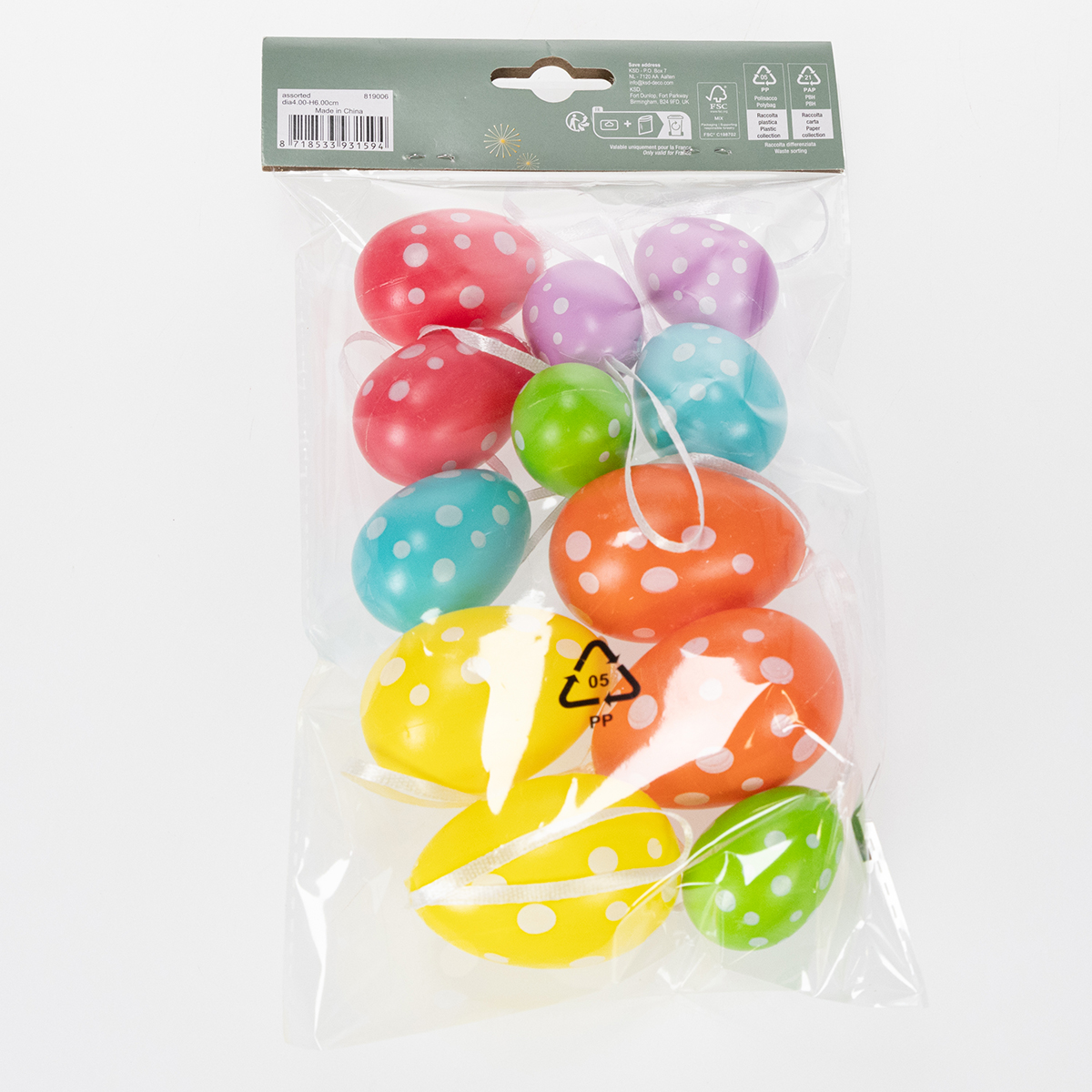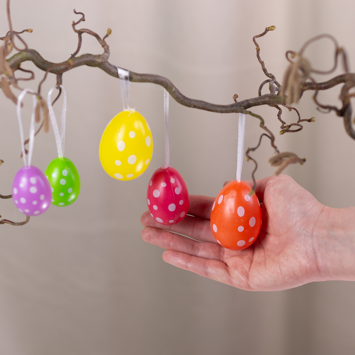 Te kolorowe, wiszące pisanki to idealny dodatek do Twoich wielkanocnych dekoracji. Zestaw zawiera 12 jajek wykonanych z wytrzymałego plastiku, dzięki czemu dzieci mogą je łatwo powiesić. Kolory: żółty, niebieski, zielony, pomarańczowy, różowy i fioletowy, w połączeniu z białymi kropkami, tworzą żywy i radosny wygląd. Duże jajko ma około 6 cm wysokości – idealny rozmiar do zawieszenia na gałęziach, w kompozycjach kwiatowych lub na wielkanocnej choince.