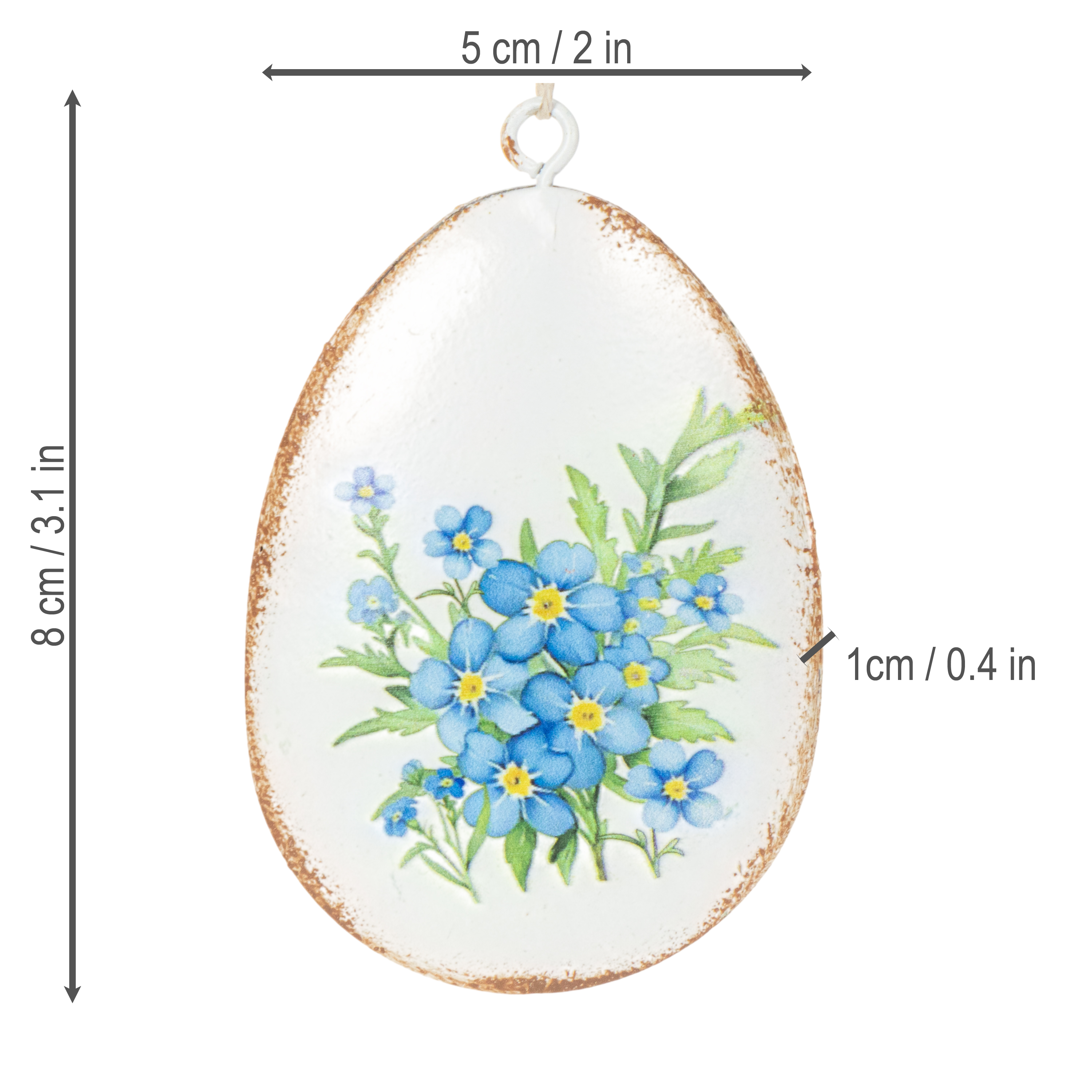 Te ozdobne metalowe pisanki zachwycają rozmiarem i wyglądem. Mierzą 8 cm wysokości i 5 cm średnicy, dzięki czemu idealnie nadają się do różnorodnych zastosowań. Lekko matowa, biała podstawa uzupełniają cztery różne motywy kwiatowe, które ożywiają wiosnę: od delikatnych niezapominajek po soczyste żonkile. Ich subtelny, vintage'owy wygląd sprawia, że są wyjątkowo gustowne i idealnie pasują do dekoracji w stylu retro, shabby chic lub rustykalnym.