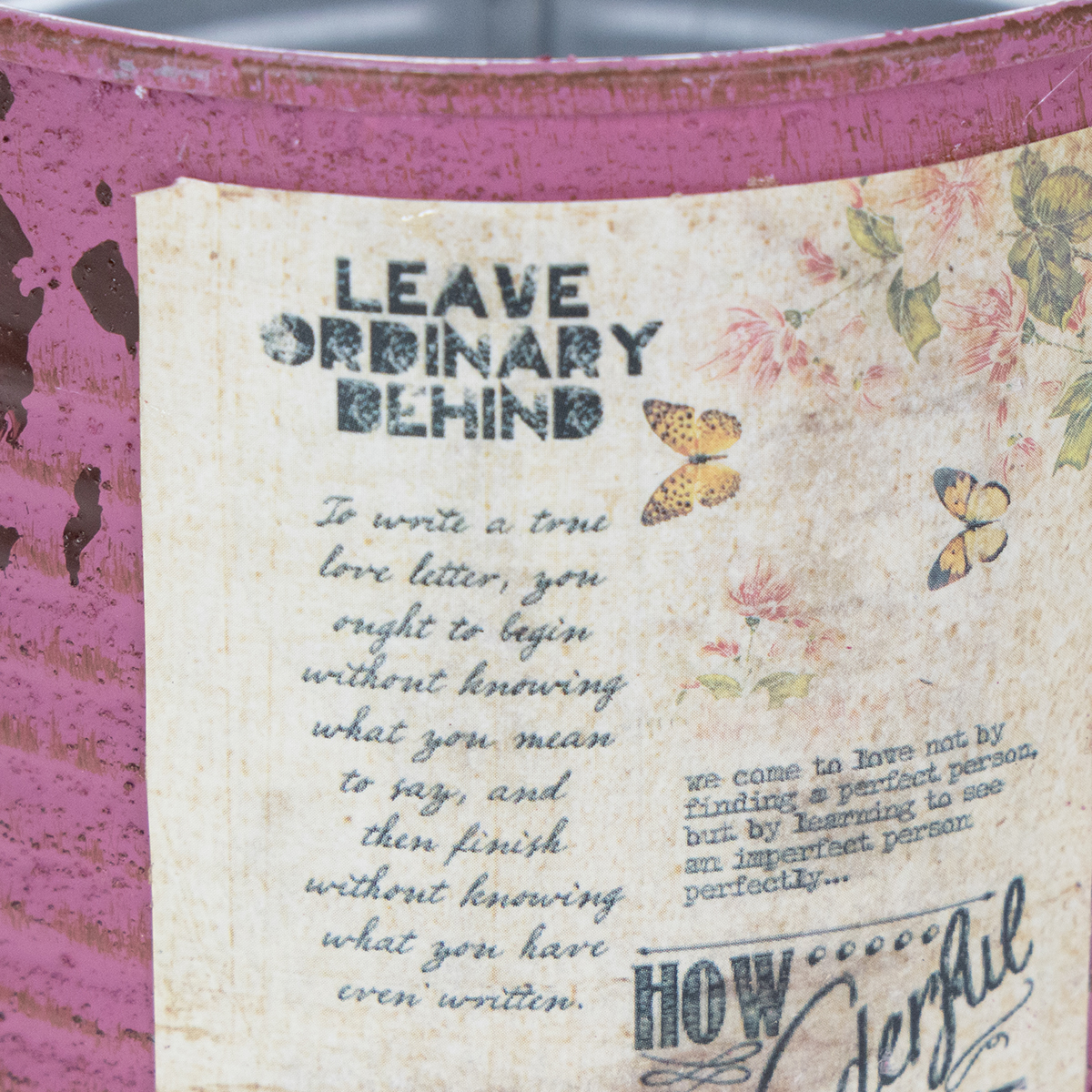 Ta doniczka w stylu vintage umiejętnie prezentuje się jako ozdobne pudełko w kolorze fioletowym. Metalowa letnia dekoracja jest pięknie dwukolorowa: ciepły rdzawy brąz widać na rowkach puszki. Fioletowy pastelowy ton jest harmonijnie zaokrąglony. Etykieta z motylami i napis różnymi czcionkami retro, a także pomalowane plamy rdzy na donicy tworzą nostalgiczną atmosferę sadzenia.