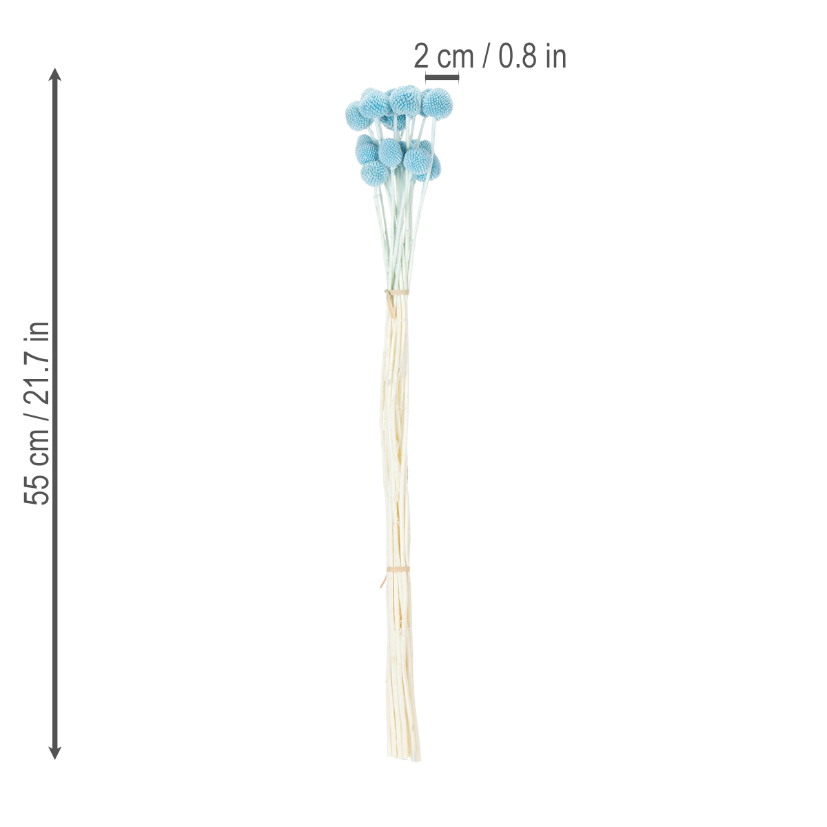 Dzięki intensywnemu niebieskiemu kolorowi i długości 55 centymetrów, suszone kwiaty Craspedii będą prawdziwą ozdobą każdego wazonu. Główki mają średnicę od dwóch do trzech centymetrów, co nadaje tej dekoracji kwiatowej uroczą, a zarazem subtelną fakturę. Idealnie nadają się do minimalistycznych wazonów lub jako kreatywny dodatek do kompozycji kwiatowych. Niezależnie od tego, czy szukasz nowoczesnej, suszonej dekoracji do salonu, chcesz stworzyć kolorową aranżację stołu na uroczystość, czy planujesz oryginalny projekt DIY – dzięki tym kwiatom Craspedii zawsze uzyskasz stylową aranżację.