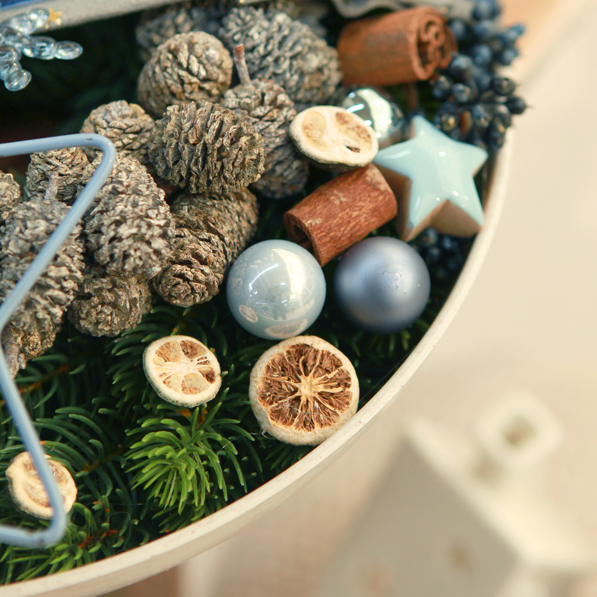 Materiały: Naturalne materiały, takie jak szyszki, drewno, kora, mech, gałązki, liście, suszone kwiaty, wodorosty i włókno kokosowe.