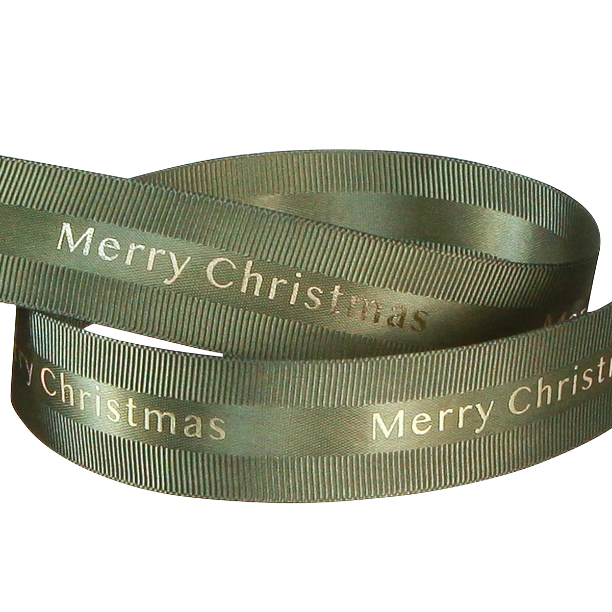 Świąteczna wstążka bożonarodzeniowa w kolorze ciemnozielonym ze złotym napisem „Wesołych Świąt”, szerokość 25 mm, długość 20 m