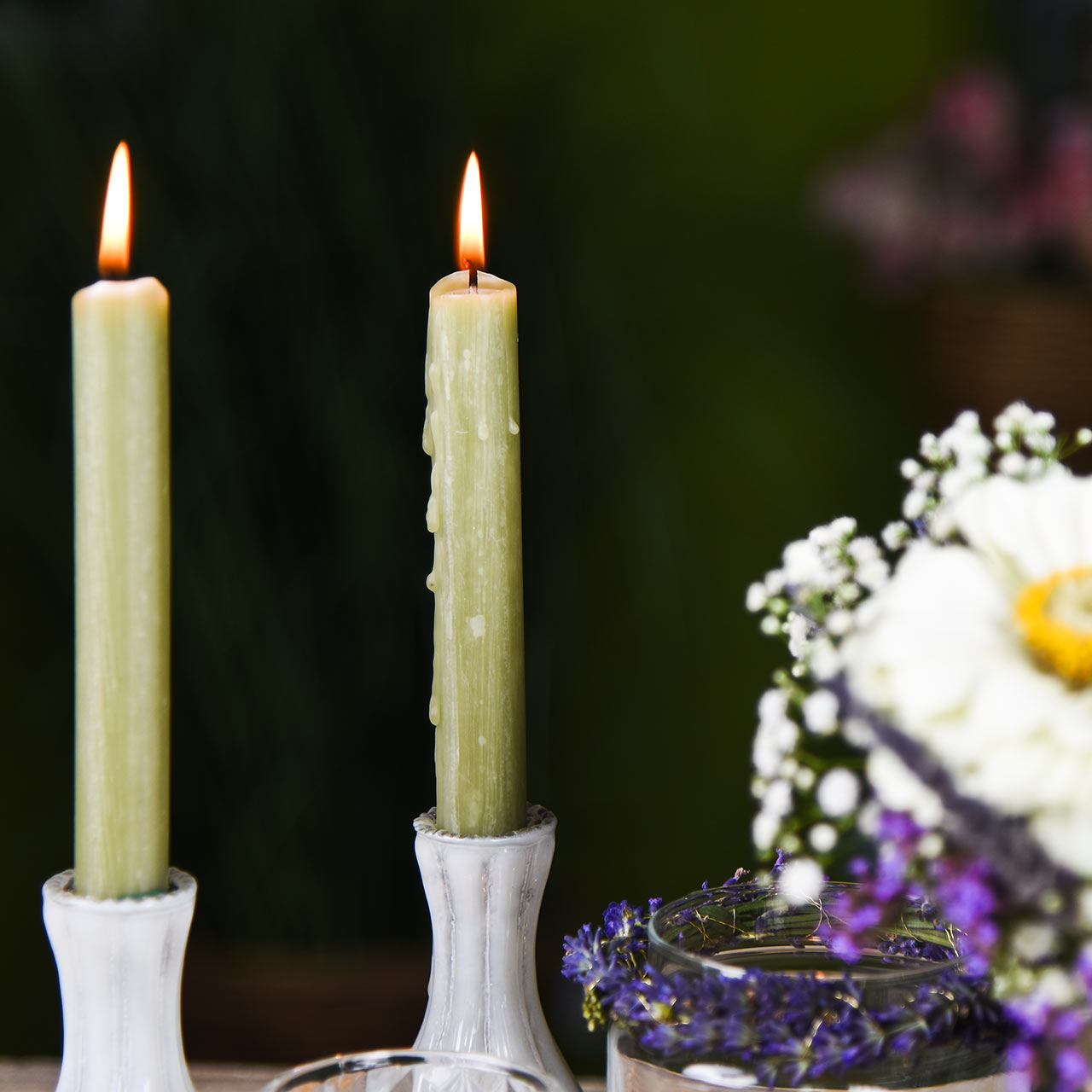 Na marginesie, dla mniejszych dekoracji lub jeśli szukasz dekoracji świecowych o różnych wysokościach, zielone świece patyczkowe są również dostępne w mniejszej wersji w naszym sklepie.