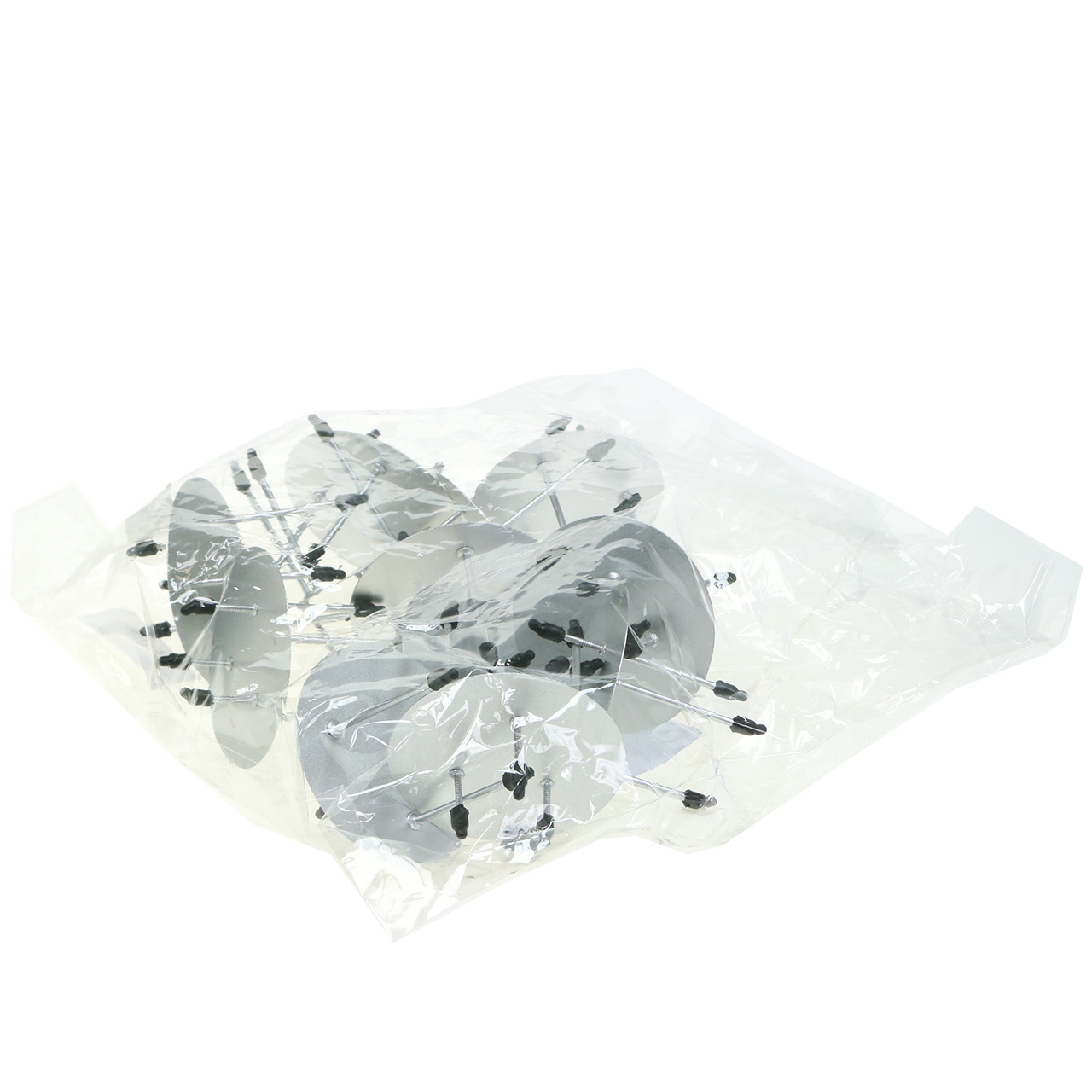 Świecznik na korki marki VIANA w kolorze srebrnym ma całkowitą wysokość 7,5 centymetra i średnicę około 6,5 centymetra. Trzpień świecy ma długość około 2,5 centymetra, natomiast trzpienie wtykowe mają długość około 5 centymetrów. W opakowaniu znajduje się 12 sztuk tych pięknych świeczników do aranżacji kwiatowych.