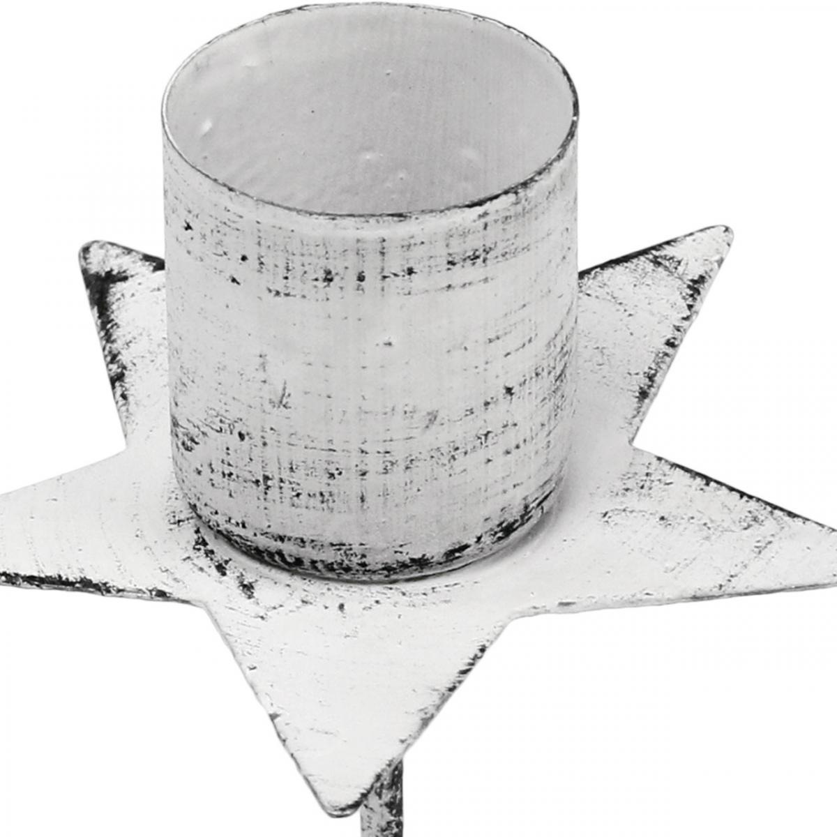 Biały metalowy świecznik wyróżnia się modnym wzornictwem shabby chic, dzięki czemu idealnie pasuje do naturalnych, rustykalnych dekoracji świątecznych. Długi uchwyt na szpikulcu ułatwia wkładanie świecznika w wianki z gąbki florystycznej lub słomianych. Świecznik można również włożyć do pojemników wypełnionych ziemią lub ozdobnym piaskiem, tworząc gwiazdę.