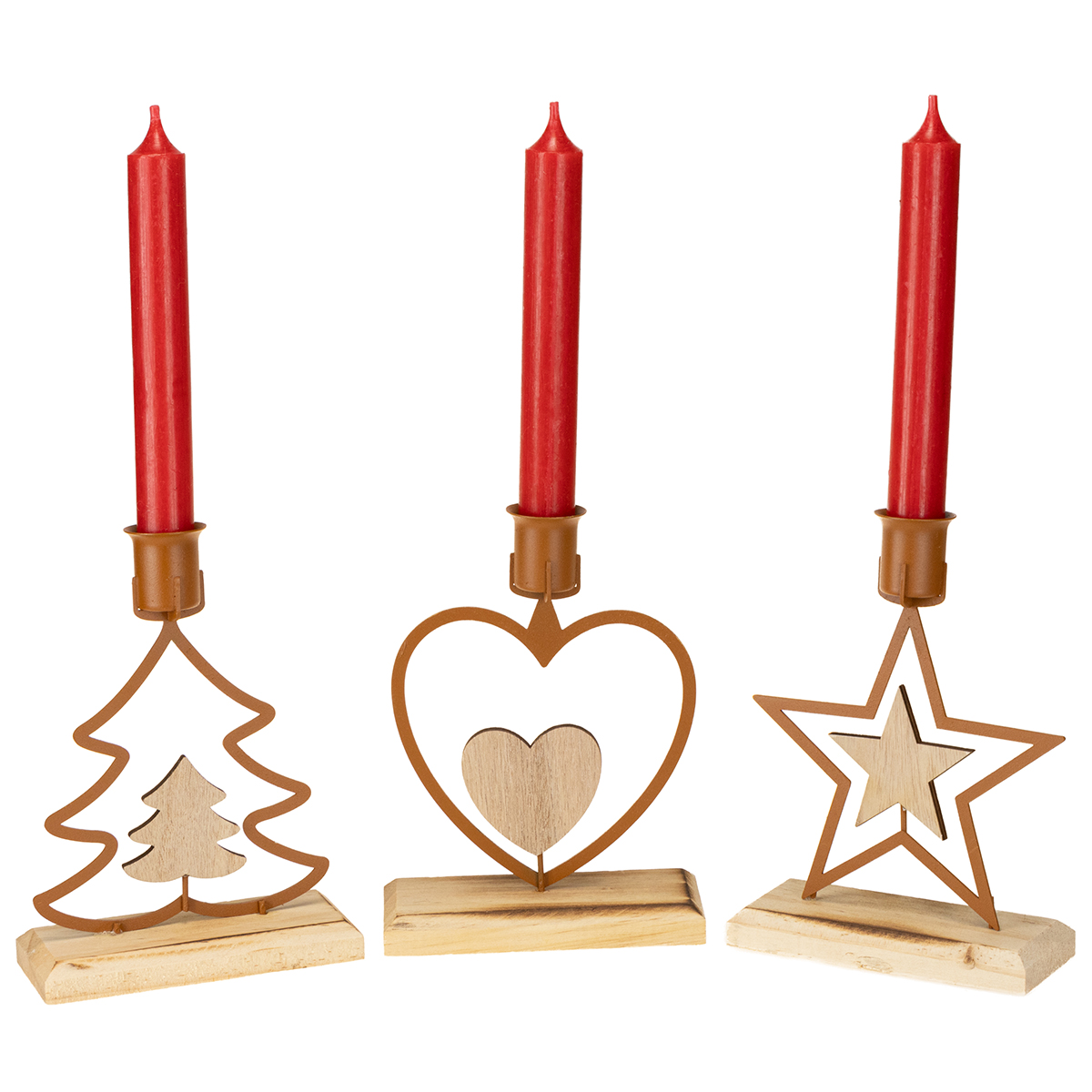 Sylwetka z rdzawobrązowego malowanego metalu ze świecznikiem na długie świece osadzona jest na subtelnie płomieniowanej podstawie z naturalnego drewna. Pośrodku pod świecznikiem gwiazda, serce i choinka znów można zobaczyć jako drewniane motywy.