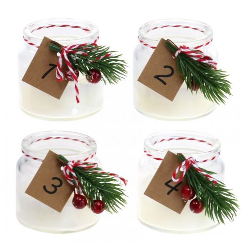Ten szklany świecznik na tealighty jest dostarczany ze świecą i jest dostarczany w zestawie po cztery sztuki. Więc masz odpowiednią liczbę świec na Adwent.Szkiełko świecy zdobi czerwono-biała opaska w paski. Do wstążki przywiązana jest mała zielona gałązka sosny oraz gałązka z małymi jagodami ostrokrzewu. Brokat na nim sprawia, że gałązki i jagody wyglądają na lodowate. Na małej kartonowej kartce widnieją cyfry od 1 do 4. W końcu w każdą niedzielę adwentu zapala się tylko jedną świecę.