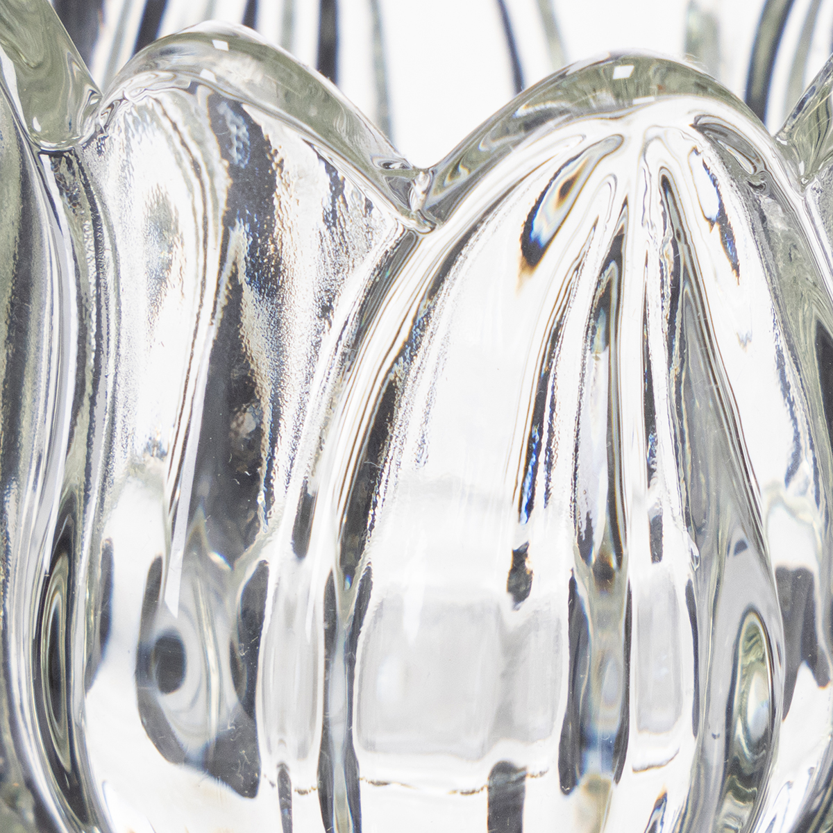 Ten świecznik na podgrzewacze umiejętnie łączy ponadczasową elegancję z praktyczną funkcjonalnością. Wykonany z wysokiej jakości, przezroczystego szkła, zachwyca zarówno solidną konstrukcją, jak i wyrafinowanym, kwiatowym wzorem. Przezroczysta powierzchnia pięknie eksponuje delikatną, kwiatową formę, czyniąc go dekoracyjnym elementem nie tylko jako źródło światła, ale także po otwarciu.