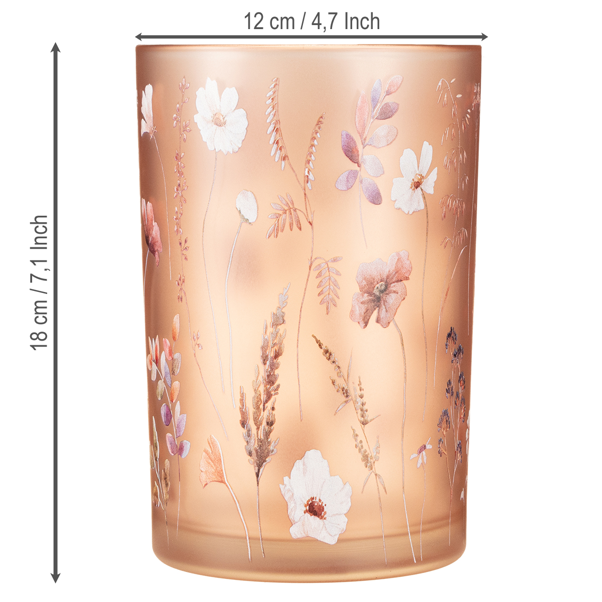 Ten świecznik o wysokości 18 cm i średnicy 12 cm to prawdziwa perełka zarówno do użytku wewnętrznego, jak i zewnętrznego. Delikatnie matowe szkło rozprasza światło świecy przyjemnym, ciepłym blaskiem, a piękny motyw kwiatowy emanuje nie tylko kwiatową elegancją, ale i naturalnym urokiem. Delikatne kolory, od różu po żywe akcenty, czynią go uniwersalnym elementem dekoracyjnym – idealnym do stylu rustykalnego, trendu vintage lub po prostu dla każdego, kto ceni ciepłą i przyjazną atmosferę.