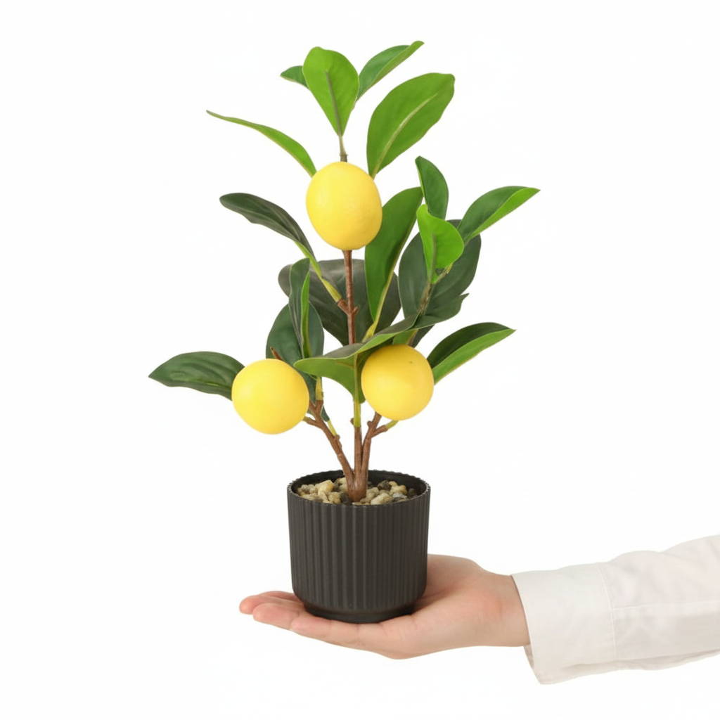 - Sztuczne drzewko cytrynowe w doniczce z cytrynami wyglądającymi jak prawdziwe